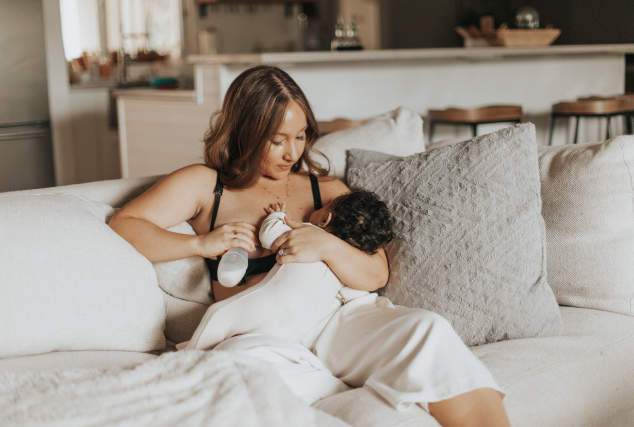 - Cố định dụng cụ hứng sữa trên bầu ngực mẹ, đảm bảo ti mẹ giữa cổ bình