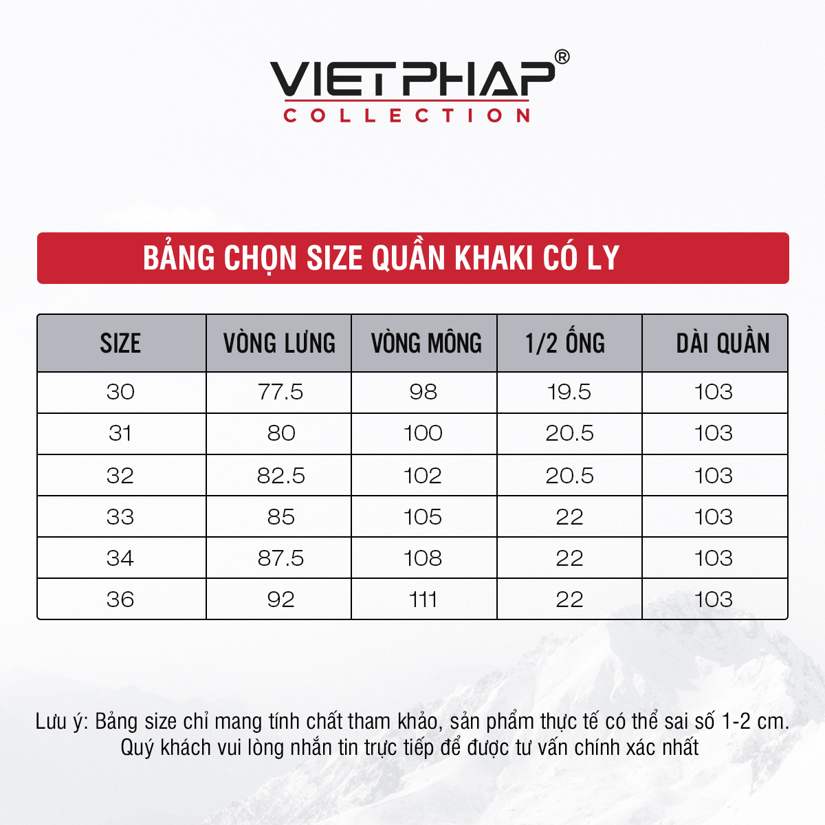 Quần Kaki Có Ly VIỆT PHÁP - Chất liệu: 98% Cotton, 2% Spandex - Size: 30 - 31 - 32 - 33 - 34 - 36 - Màu: 6 màu - Kiểu dáng: Quần có
