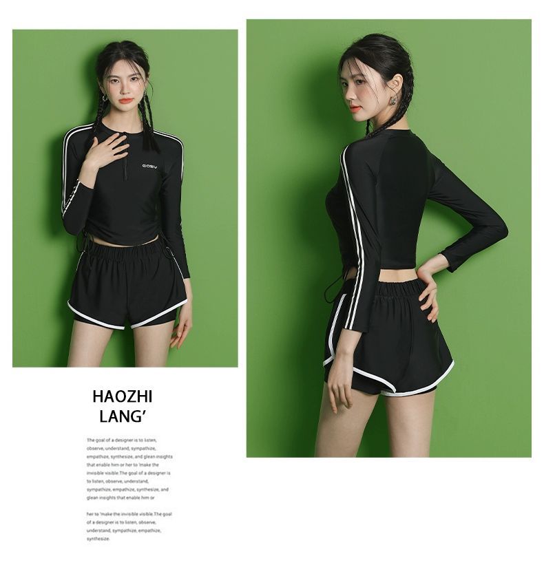 Set Đồ Bơi Nữ Rời Đùi Dài Tay Đi Biển Đi Bơi Chất liệu Polyester 95%, mật độ dệt vừa Áo có sẵn lớp đệm, hông áo có thể rút lên làm croptop cá tính