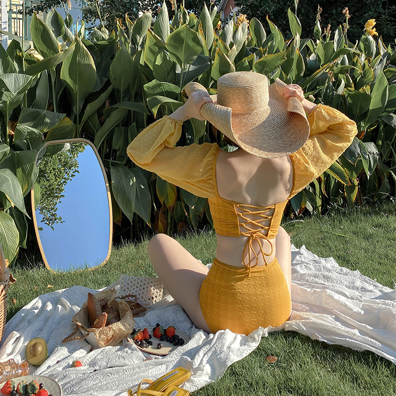 Set Đồ Bơi Nữ Rời Đùi Dài Tay Đi Biển Đi Bơi Chất liệu Polyester 88%, mật độ dệt vừa Áo có sẵn lớp đệm, hông áo có thể rút lên làm croptop cá tính