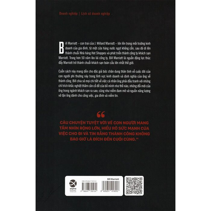 Bill Marriott mang đến cho độc giả bức chân dung thân tình về cuộc đời của con người phi thường này trong lĩnh vực kinh doanh và định nghĩa của ông về thành công. Bill chia sẻ mọi chi tiết về việc cá nhân ông phải đấu tranh với những chỉ trích khắc nghiệt thâm căn cố đế của bố mình như thế nào; những đổi mới của ông trong ngành khách sạn ra sao; cũng như niềm đam mê và nguồn năng lượng vô tận ông dành cho công việc, gia đình và niềm tin.