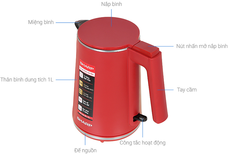 Bình đun siêu tốc Sharp EKJ-10DVPS-RD sở hữu màu đỏ pastel nổi bật, bắt mắt có dung tích 1 lít