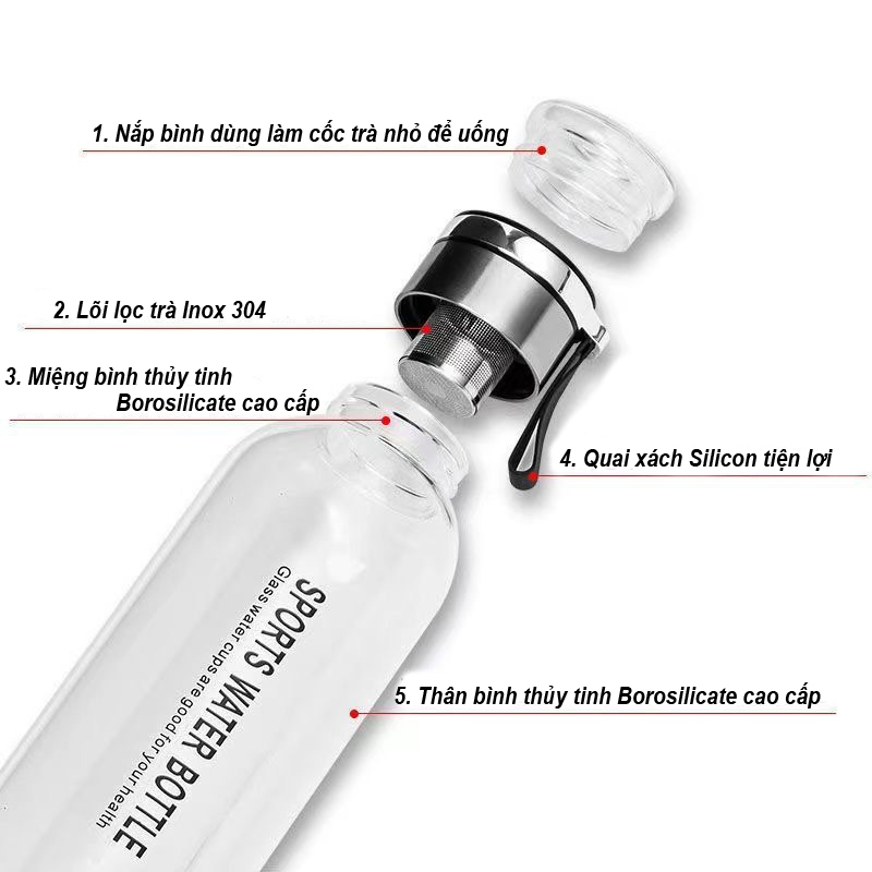 - Chất liệu: Bình nước được làm từ thủy tinh Borosilicate cao cấp dày bóng, trong suốt, chiu nhiệt -20 đến 200 độ C