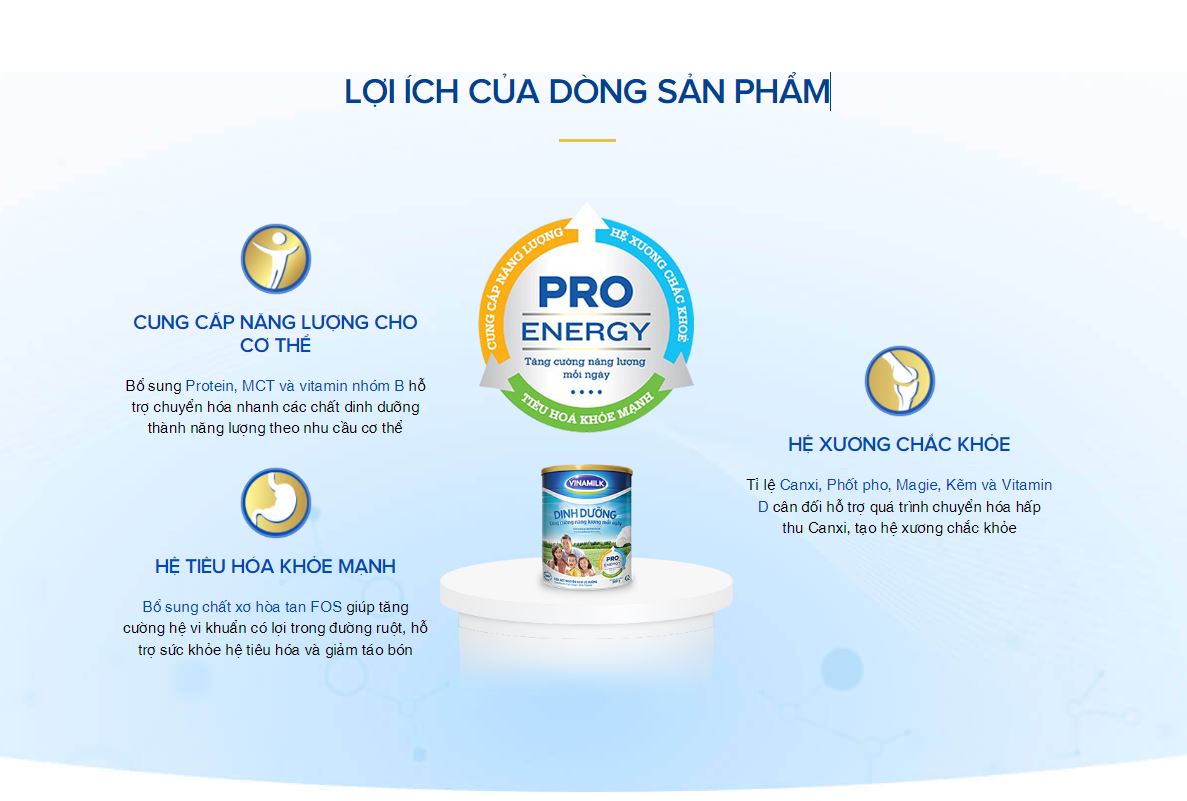 Giới thiệu Vinamilk Dinh Dưỡng với hệ dưỡng chất PRO – ENERGY giúp cung cấp năng lượng cần thiết cho cơ thể, hỗ trợ hấp thu Canxi tạo hệ xương chắc khỏe, cùng với sự