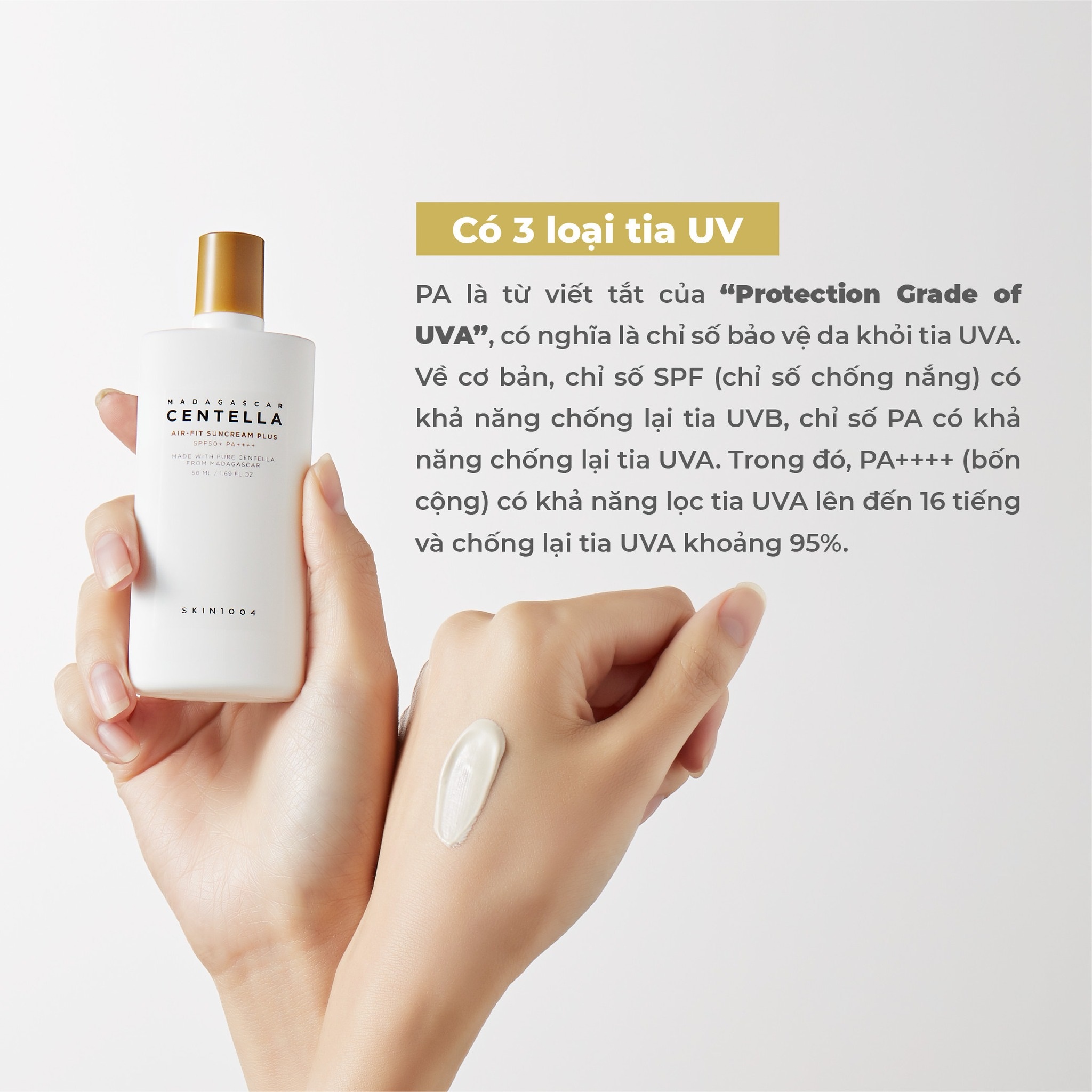 - Kem Chống Nắng Skin1004 Madagascar Centella Air Fit Suncream Plus SPF50 50ml là dòng kem chống nắng phiên bản nâng cấp với nhiều cải tiến vượt trội mang đến khả năng bảo vệ, làm dịu hiệu quả cho mọi loại da. Được thiết kế là dòng kem chống nắng vật lý có màu da để giúp làn da tươi sáng, đều màu hơn và finish hoàn hảo cho da không gây bết dính, khó chịu.