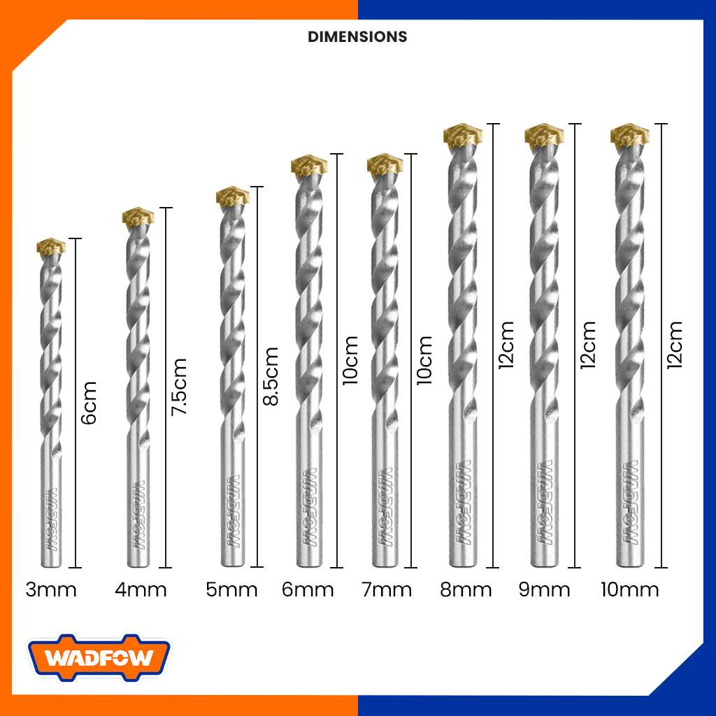 Bộ Đa Dạng Kích Cỡ: Bộ mũi khoan bê tông đuôi gài WMJ6B08 gồm 8 kích cỡ khác nhau: 3X60, 4X75, 5X85, 6X100, 7X100, 8X120, 9X120, 10X120. Điều này cho phép bạn linh hoạt lựa chọn mũi phù hợp với từng công việc cụ thể.