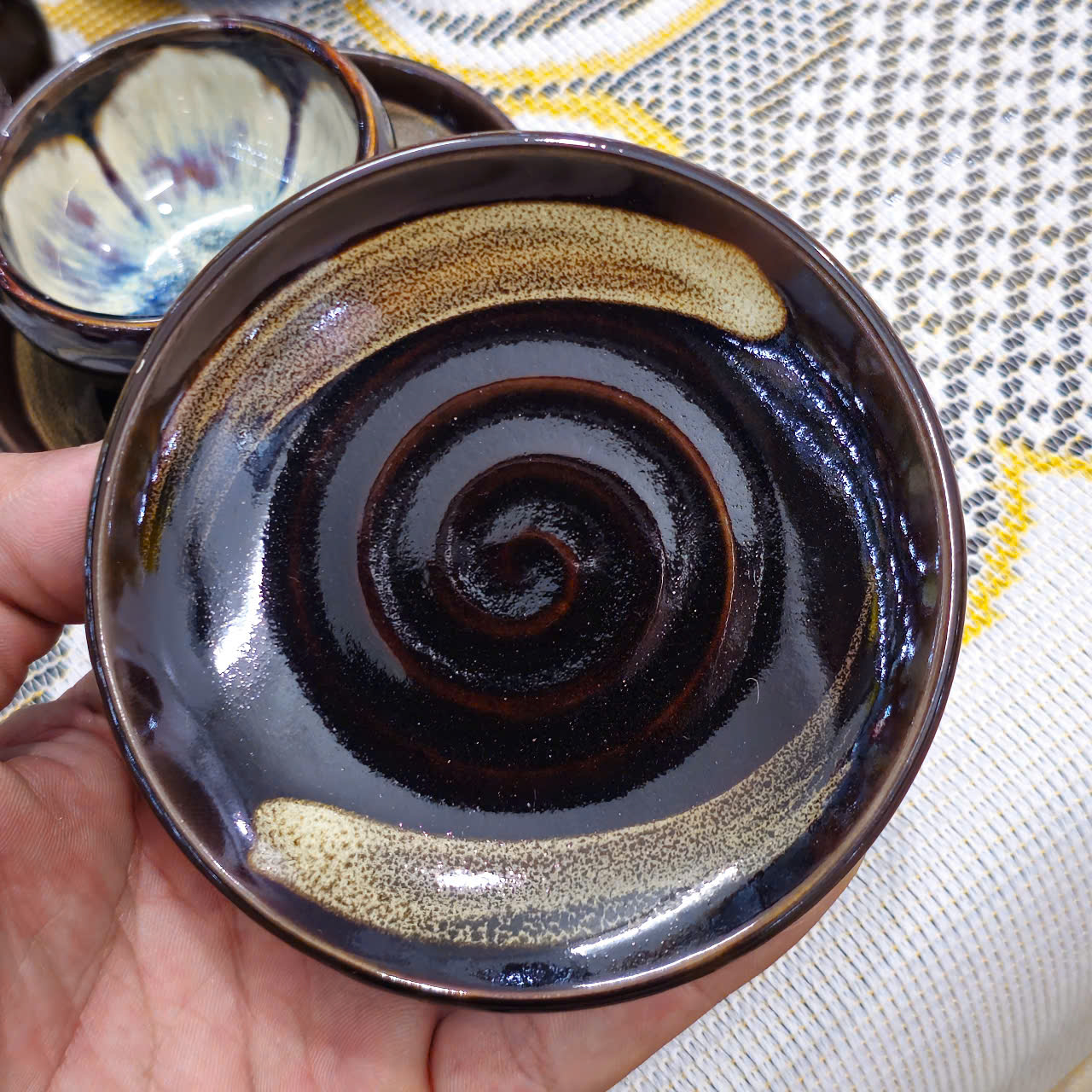 - Mỗi chén được làm thủ công với men đen bóng, đồng bộ với ấm trà.
