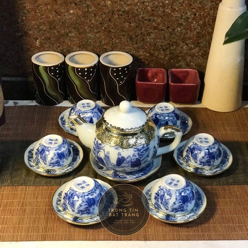 Bộ ấm trà men lam trắng bát tràng được vẽ họa tiết cổ với tích “trúc lâm thất hiền” là một trong những bộ ấm trà thông dụng của làng cổ Bát Tràng. Họa tiết