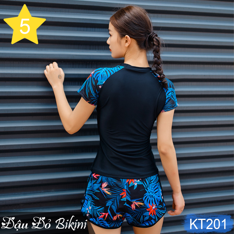- Mẫu đồ bơi mới nhất cho các bạn nữ thích sự trẻ trung kín đáo mà vẫn thu hút khi đi biển, đi bơi. - Áo dáng ngắn tay phối hoạ tiết trẻ khoẻ,