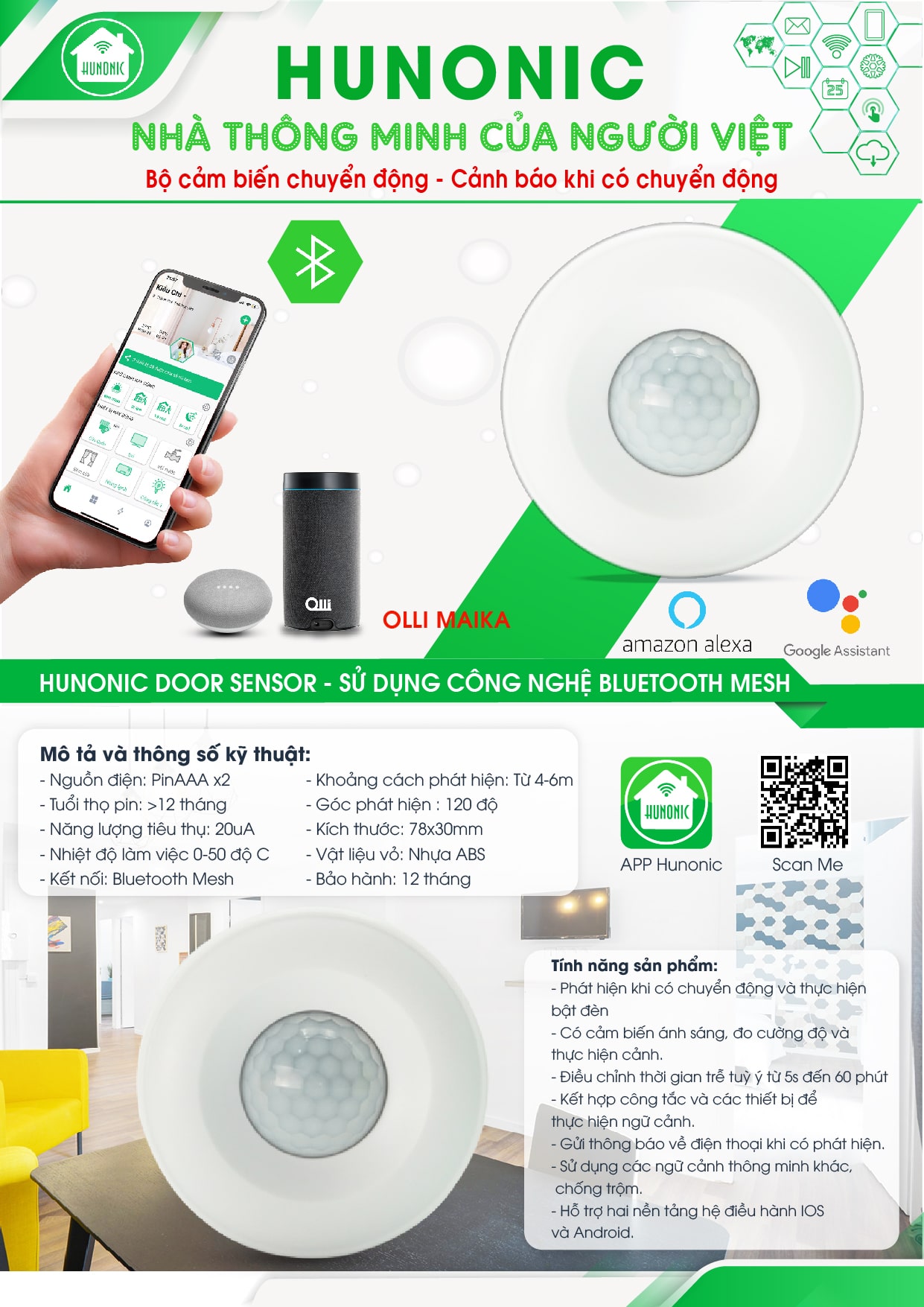 - Cảm biến chuyển động Hunonic Pir Sensor là một sản phẩm sử dụng công nghệ Bluetoot Mesh hoàn thiện đầu tiên tại Việt Nam. Thân và vỏ được làm từ nhựa ABS nguyên sinh nên có khả năng chịu nhiệt và độ bền cao.