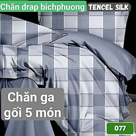 BỘ CHĂN DRAP GỐI TENCEL GỒM 5 MÓN: - 2 Vỏ gối nằm 50X70cm + 1 vỏ gối ôm 35x100cm • 1 ga {bọc nệm dưới 25 cm} - 1 mền chần gòn 1m8x2m2 Lưu