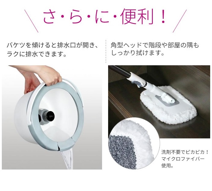 • Với tính năng đột phá, có thể dễ dàng tháo lắp, xả giẻ lau tự động bằng cách xoay tròn. Khi vắt nước, chỉ cần nhấn nhẹ tay vào cán gậy, tận dụng lực quay của lồng vắt để vắt khô, lực ly tâm sẽ làm nước văng sạch ra tạo độ khô cho đầu lau.