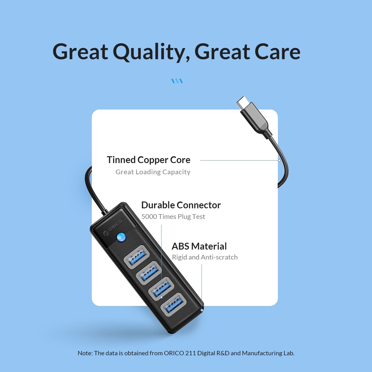 1. Input: USB 3.0 A Male 2. Output: USB 3.0 A Female × 4 3. Speed up to 5Gbps 4. Support 10 TB hard drive 5. With USB-C power port DC 5V 6. plug &