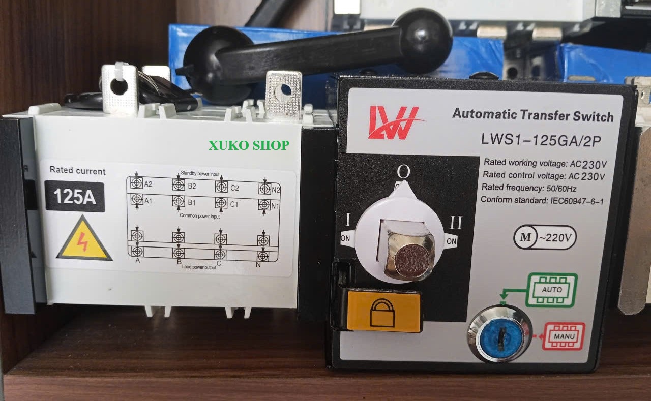 Thiết kế: Thiết bị gồm hai phần chính: phần cơ đóng cắt và phần điều khiển. Phần cơ đóng cắt có các đầu nối dây điện lớn, cho thấy khả năng chịu dòng điện cao (125A). Phần điều khiển có các nút bấm, đèn báo và khóa chuyển chế độ (tự động/bằng tay). Có tay cầm để thao tác bằng tay khi cần thiết. Trên mặt sản phẩm có ghi rõ các thông tin như: Automatic Transfer Switch Các thông số điện áp. 1 pha 220V, 3 pha 380V Vị trí chuyển mạch I và II. Vị trí Auto. Chức năng: ATS tự động chuyển nguồn điện sang nguồn dự phòng khi nguồn chính bị mất điện, và ngược lại. Điều này đảm bảo nguồn điện liên tục cho các thiết bị quan trọng. Có chế độ chuyển mạch bằng tay khi cần thiết. Ứng dụng: Sử dụng trong các hệ thống điện yêu cầu độ tin cậy cao, như: Bệnh viện Trung tâm dữ liệu Nhà máy sản xuất Tòa nhà văn phòng Hệ thống điện năng lượng mặt trời. Ưu điểm: Tự động hóa quá trình chuyển nguồn, giảm thiểu thời gian mất điện. Đảm bảo an toàn cho hệ thống điện và thiết bị. Thiết kế chắc chắn, chịu được dòng điện lớn.