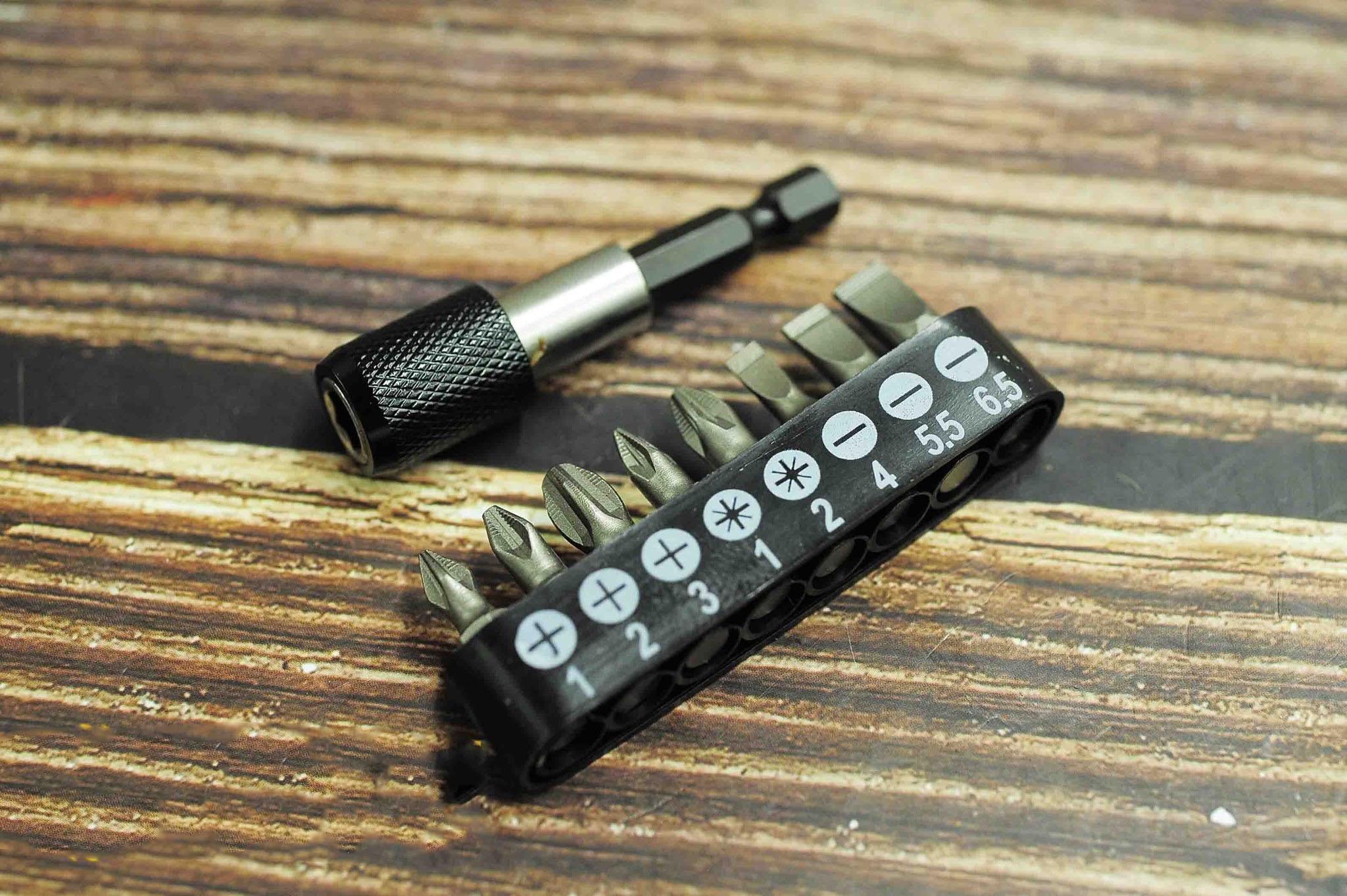 - Bộ 9 đầu tua vít gồm các size: PH1, PH2, PH3, SL4.0 ,SL5.5, SL6.5, PZ1, PZ2