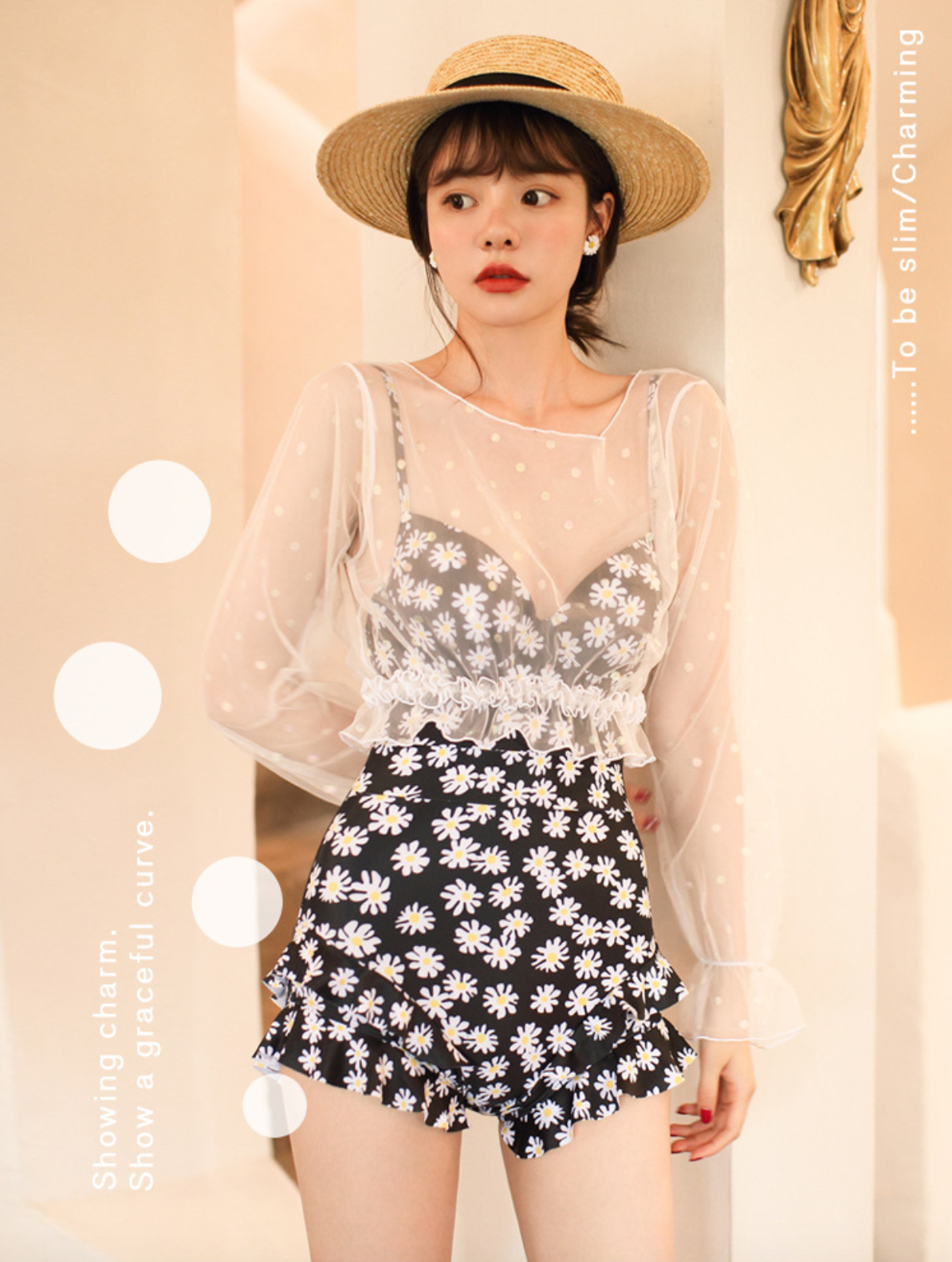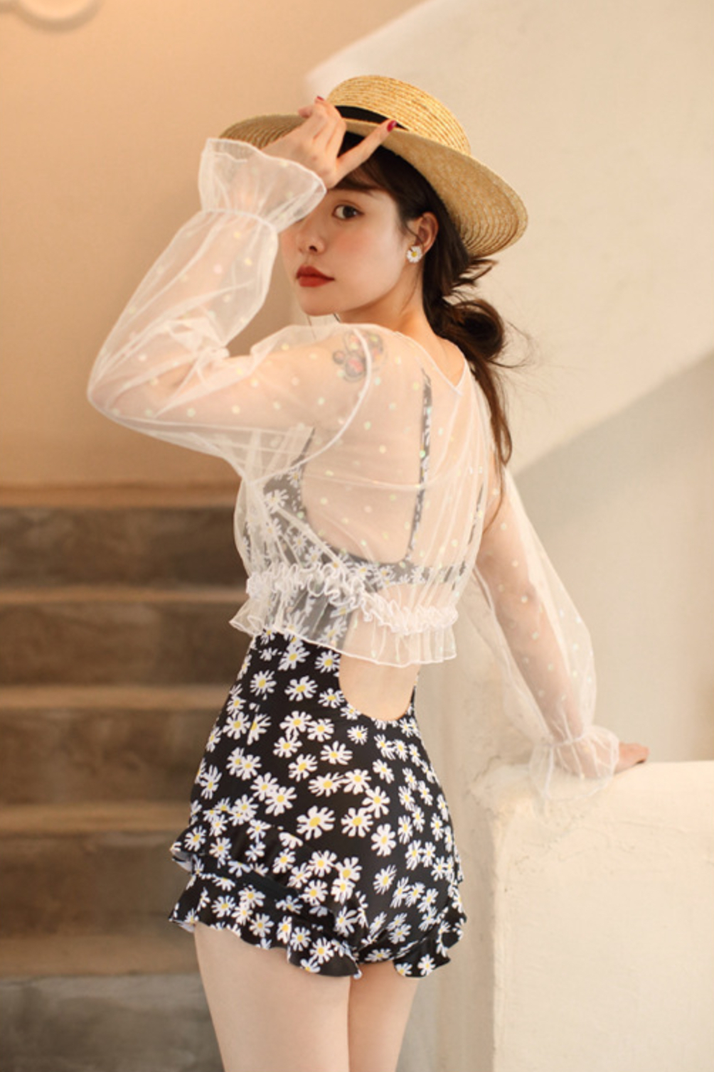 ✨Bộ đồ bơi bikini nữ 1 mảnh đi tắm biển hoa cúc kèm áo croptop ren trắng chấm bi tiểu thư hot trend 2021- B02