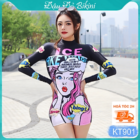 ✨Bộ Đồ Bơi Nữ Liền Thân Quần Đùi Tay Dài, Chống Nắng Tối Ưu, Khóa Kéo Sau Tiện Lợi, Chất Vải Thun Lạnh Co Giãn Cao, Nhanh Khô - Phom Dáng Ôm Gọn, Tôn Dáng | KT901