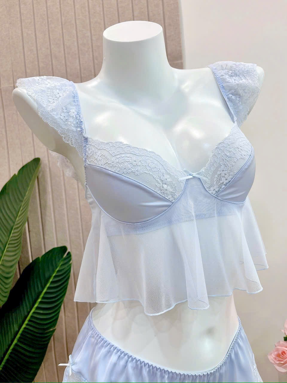 Bộ đồ ngủ hai dây lụa xanh dương nhạt với chi tiết ren quần cách điệu gợi cảm - Màu sắc: xanh dương nhạt - Chất liệu: lụa - Xuất xứ: toàn bộ sản phẩm