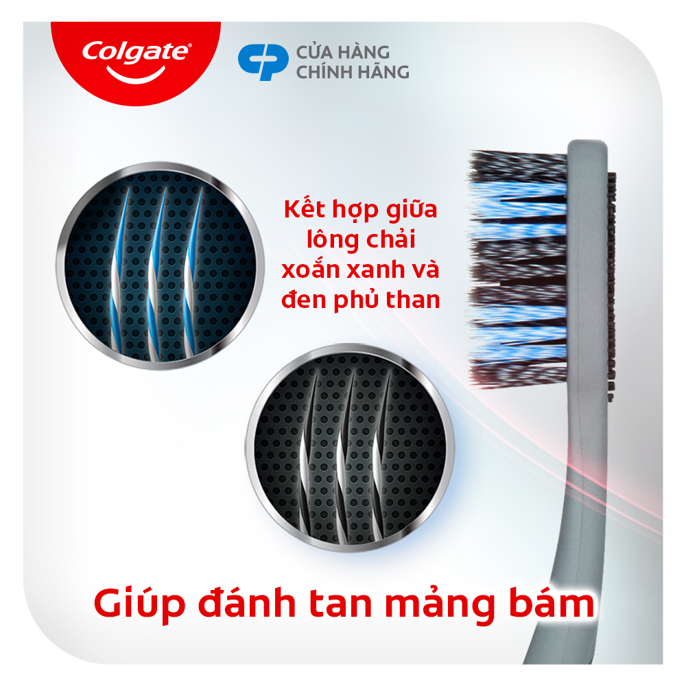 - Sự kết hợp giữa lông chải xoắn kép màu xanh với lông chải đen phủ than giúp đánh tan mảng bám, loại bỏ vết ố trên răng
