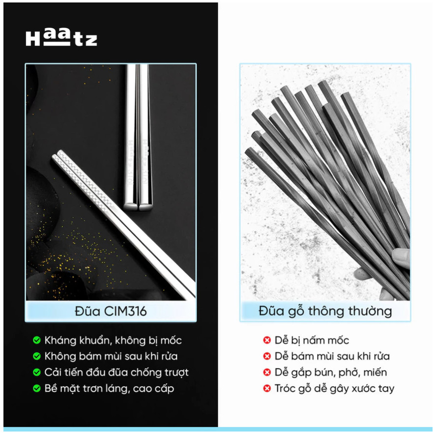 Trong khi các loại đũa gỗ hay nhựa dễ bị mòn, ố màu và không đảm bảo an toàn vệ sinh, CIM316 mang đến giải pháp tối ưu với độ bền vượt trội và khả năng bảo vệ sức khỏe. Đầu tư một bộ đũa inox CIM316 HAATZ chính là đầu tư cho sự an tâm và chất lượng sống của gia đình bạn.