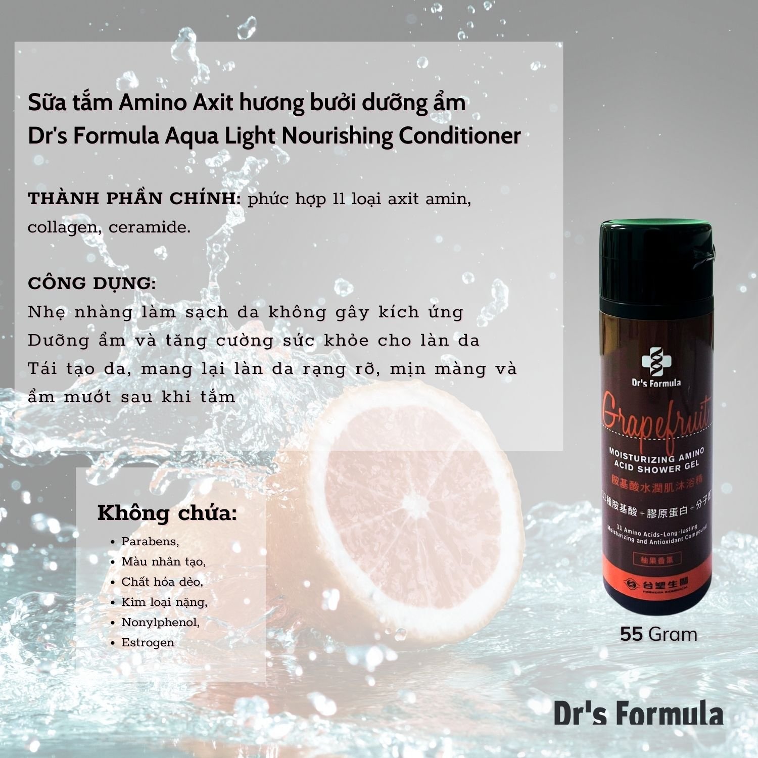 - Sữa tắm axit amin hương bưởi dưỡng ẩm da Dr’s Formula Moisturizing Amino Acid Shower Gel Sữa tắm chứa 11 phức hợp Axit amin cần thiết cho da, bổ sung Collagen và Ceramide giúp dưỡng ẩm, nuôi dưỡng và duy trì tình trạng khỏe mạnh cho làn da. Hương thơm bưởi tươi mát cho làn da rạng rỡ, mịn màng và ẩm mượt sau khi tắm. Thành phần chính :phức hợp 11 loại axit amin + collagen + ceramide. Thể tích: 55g HDSD: Sử dụng một lượng sản phẩm vừa đủ, dùng tay hoặc bông tắm xoa nhẹ nhàng lên da, sau đó tắm sạch lại bằng nước. Lưu ý: Nếu vô tình dính vào mắt, vui lòng rửa sạch bằng nước ngay. Nếu nuốt nhầm, hãy đến bác sĩ để được chẩn đoán và điều trị. Sản phẩm có chứa nhiều thành phần chiết xuất thực vật tự nhiên nên màu sắc, mùi và độ đặc có thể thay đổi đôi chút do nhiệt độ và độ ẩm, đây là điều bình thường. Nên sử dụng hết trong vòng 6 tháng sau khi mở nắp để đảm bảo chất lượng tốt nhất. Bảo quản: Vui lòng đặt ở nơi thoáng mát và tránh ánh nắng trực tiếp.