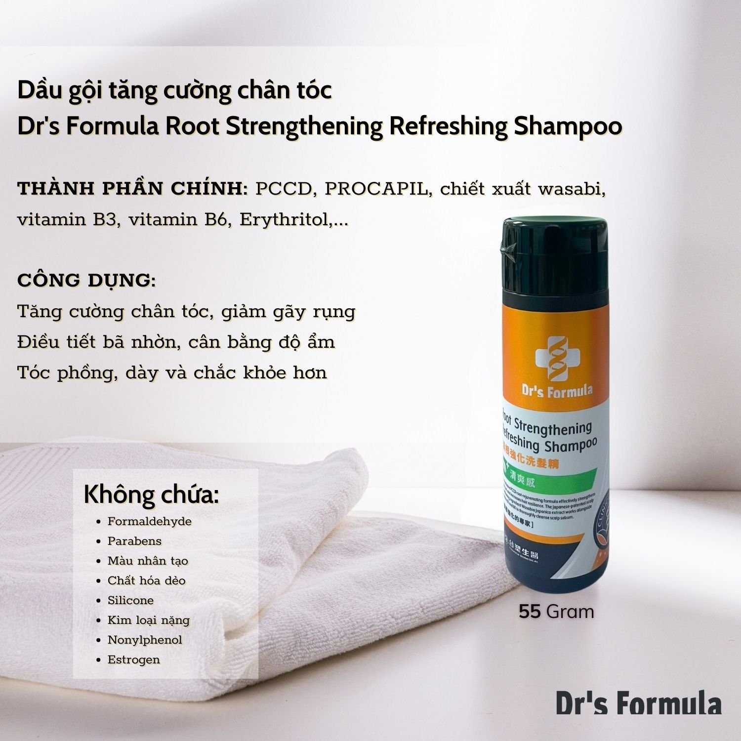 - Dầu gội tăng cường chân tóc Dr’s Formula Root Strengthening Refreshing Shampoo Dầu gội giúp nuôi dưỡng da đầu, củng cố chân tóc và giảm các vấn đề về gãy rụng. Bổ sung các thành phần giúp cải thiện bã nhờn và cân bằng độ ẩm, mang lại mái tóc tươi mát, bồng bềnh và chắc khỏe hơn. Thành phần chính: PCCD, PROCAPIL, chiết xuất wasabi, vitamin B3, vitamin B6, Erythritol, Thể tích: 55g HDSD: Làm ướt tóc và dùng lượng dầu gội phù hợp thoa và mát xa da đầu nhẹ nhàng, rồi xả sạch lại với nước.