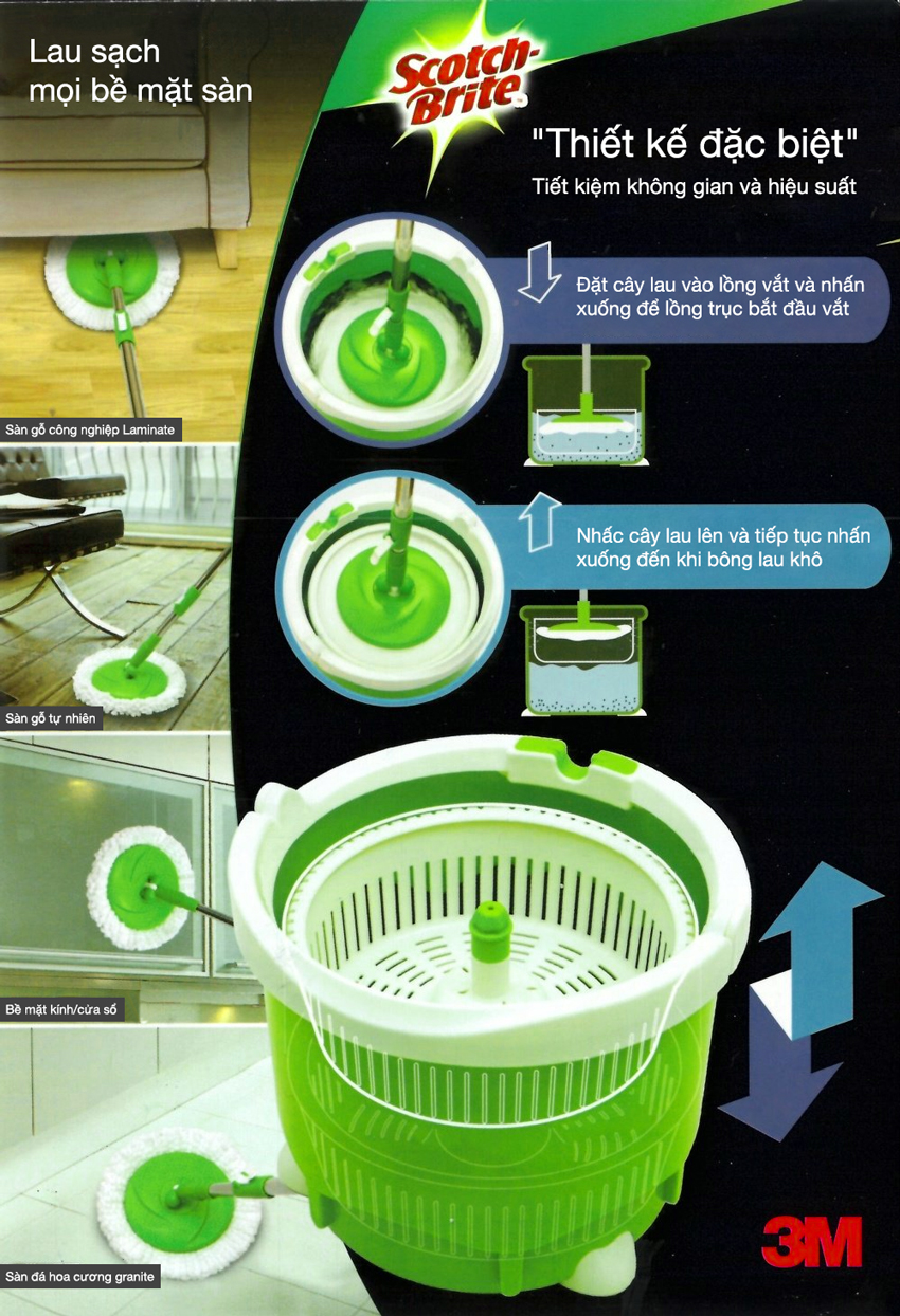 Giới thiệu Bộ lau nhà 360 độ nhỏ gọn cao cấp Scotch-Brite 3M BLN-360 Bộ lau nhà 360 độ nhỏ gọn cao cấp Scotch-Brite 3M BLN-360 là cây lau 2 in 1: giặt và vắt khô trong