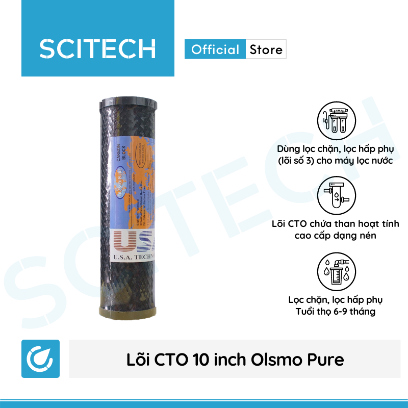 • Lõi số 3: Lõi CTO - Than hoạt tính dạng nén. Lõi CTO Olsmo Pure xuất xứ Malaysia sử dụng vật liệu than hoạt tính gáo dừa tự nhiên cao cấp dạng nén (than hoạt tính được xay nhỏ sau đó ép bằng máy thủy lực thành dạng hình trụ và bọc màng lưới bên ngoài). Lõi CTO giúp hấp phụ độc tố, màu, mùi, chất hữu cơ…; đồng thời lọc sạch các tạp chất cặn bẩn, cát, các vật trôi nổi và lơ lửng trong nước nhờ kích thước rất nhỏ, chỉ 5 micron giữa các hạt. Lõi CTO có tuổi thọ khoảng 6-9 tháng, tối đa 12 tháng.
