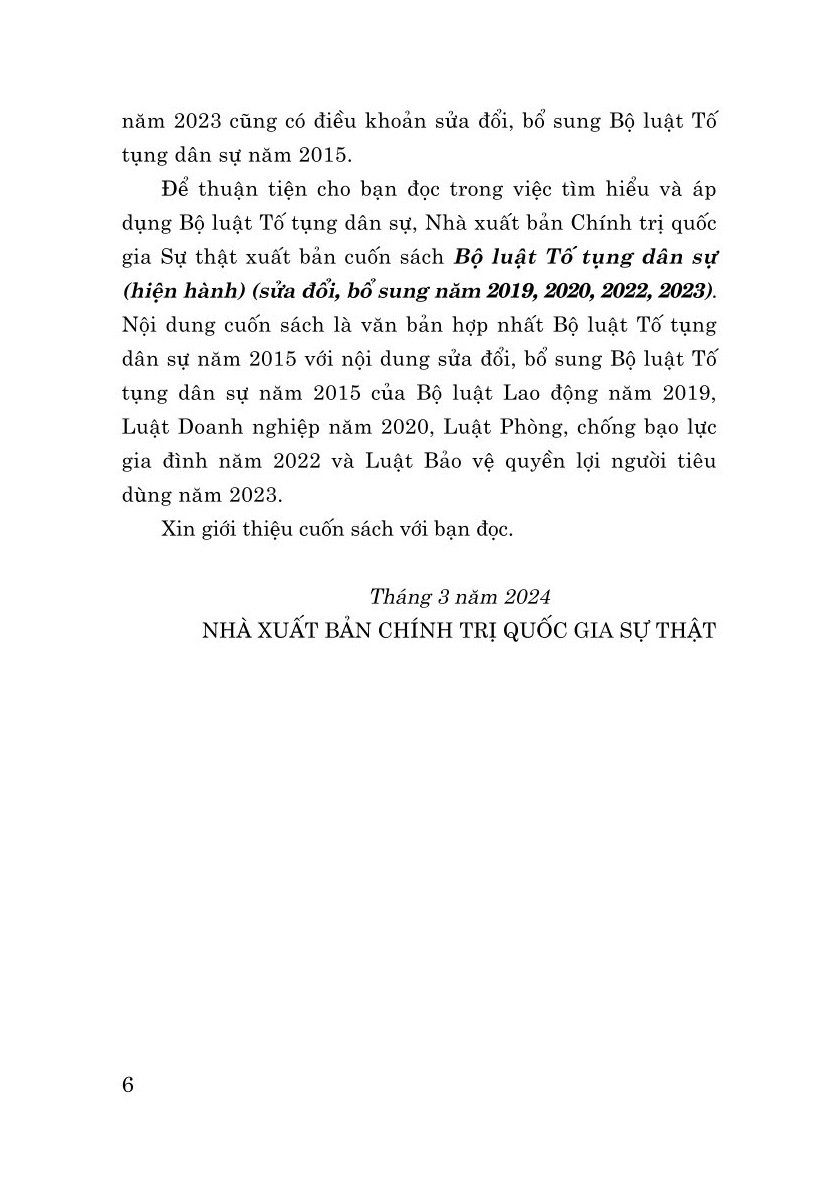Cuốn sách là văn bản nhất thể hóa của Bộ luật Tố tụng Dân sự năm 2015 với nội dung sửa đổi, bổ sung Bộ luật Tố tụng Dân sự năm 2015 của Bộ luật