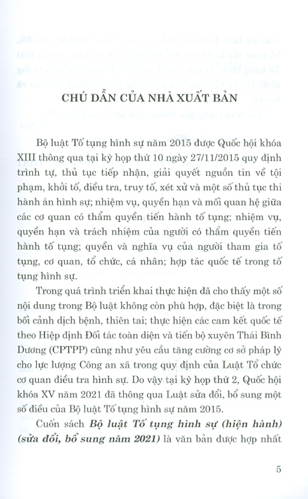 Phiên bản Bộ luật tố tụng hình sự năm 2015 (đính kèm 4 trang nội dung chỉnh sửa năm 2021), nên bạn đọc cân nhắc khi mua tham khảo Bộ luật tố tụng