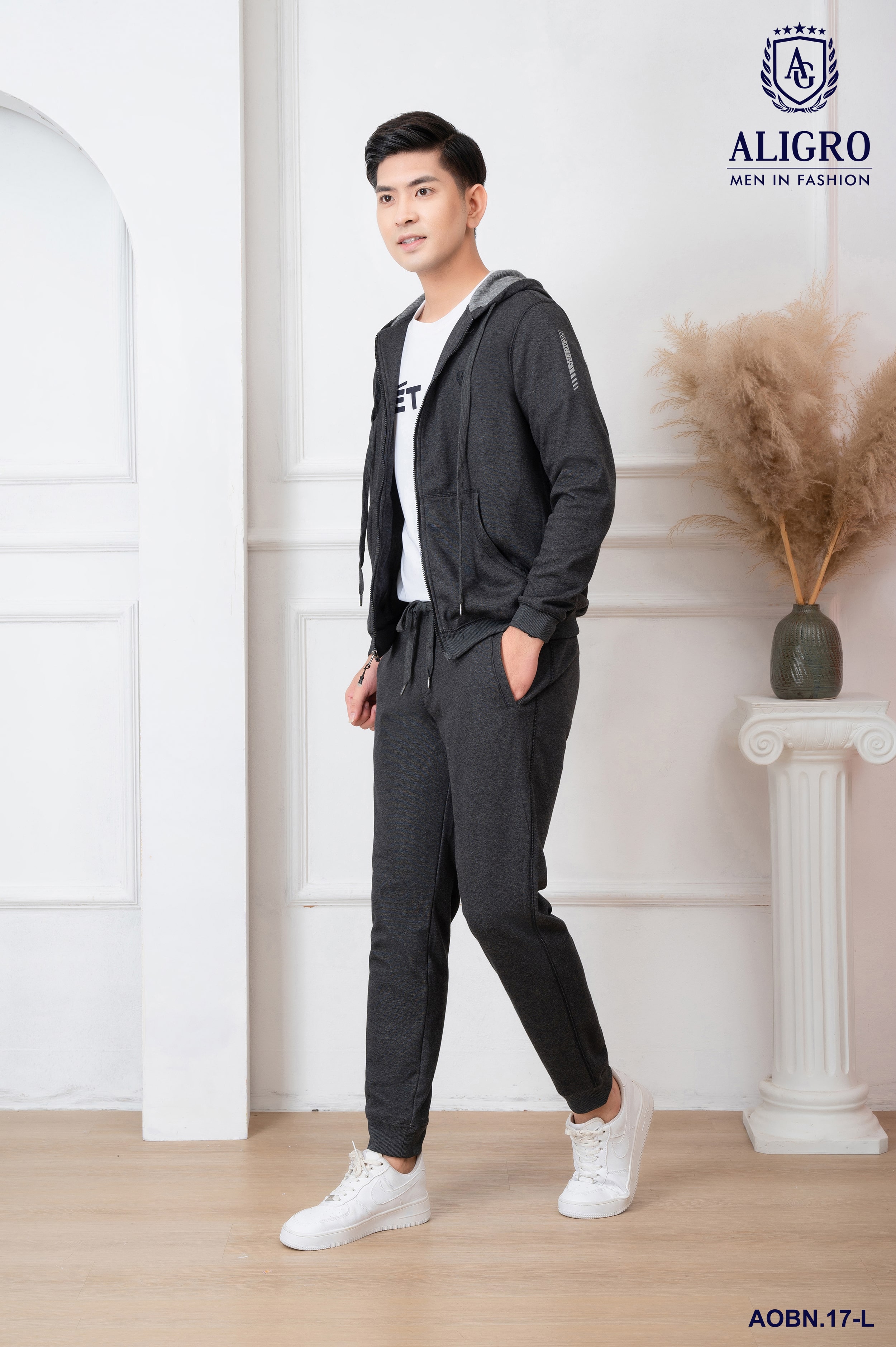 ✨Bộ nỉ hoddie nam ALIGRO kéo khóa có mũ màu ghi đậm BN.17