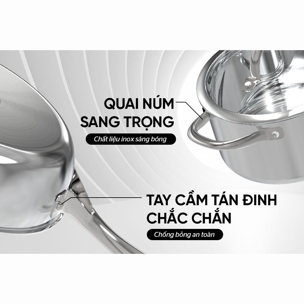 ĐẶC ĐIỂM NỔI BẬT - Bộ nồi chảo gồm 5 món tiện dụng: 2 nồi, 1 chảo, 1 quánh, 1 xửng hấp - Đáy 5 lớp tỏa nhiệt đều, giữ nhiệt lâu - Vung và