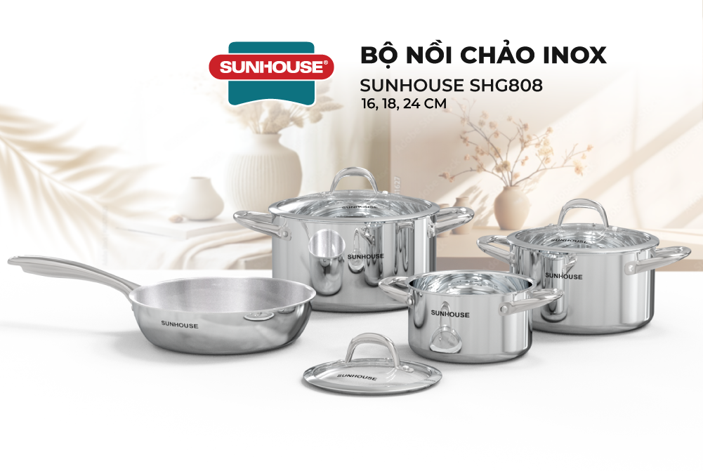 Bộ Nồi Chảo Inox 304 Đáy Liền Sunhouse SHG808 chất liệu Inox không gỉ giúp bộ sản phẩm sáng bóng và dễ dàng vệ sinh, lau chùi. Thiết kế trang nhã với những đường nét bo tròn hiện đại, góp phần tạo nên diện mạo hài hòa, đẹp mắt cho căn bếp gia đình.