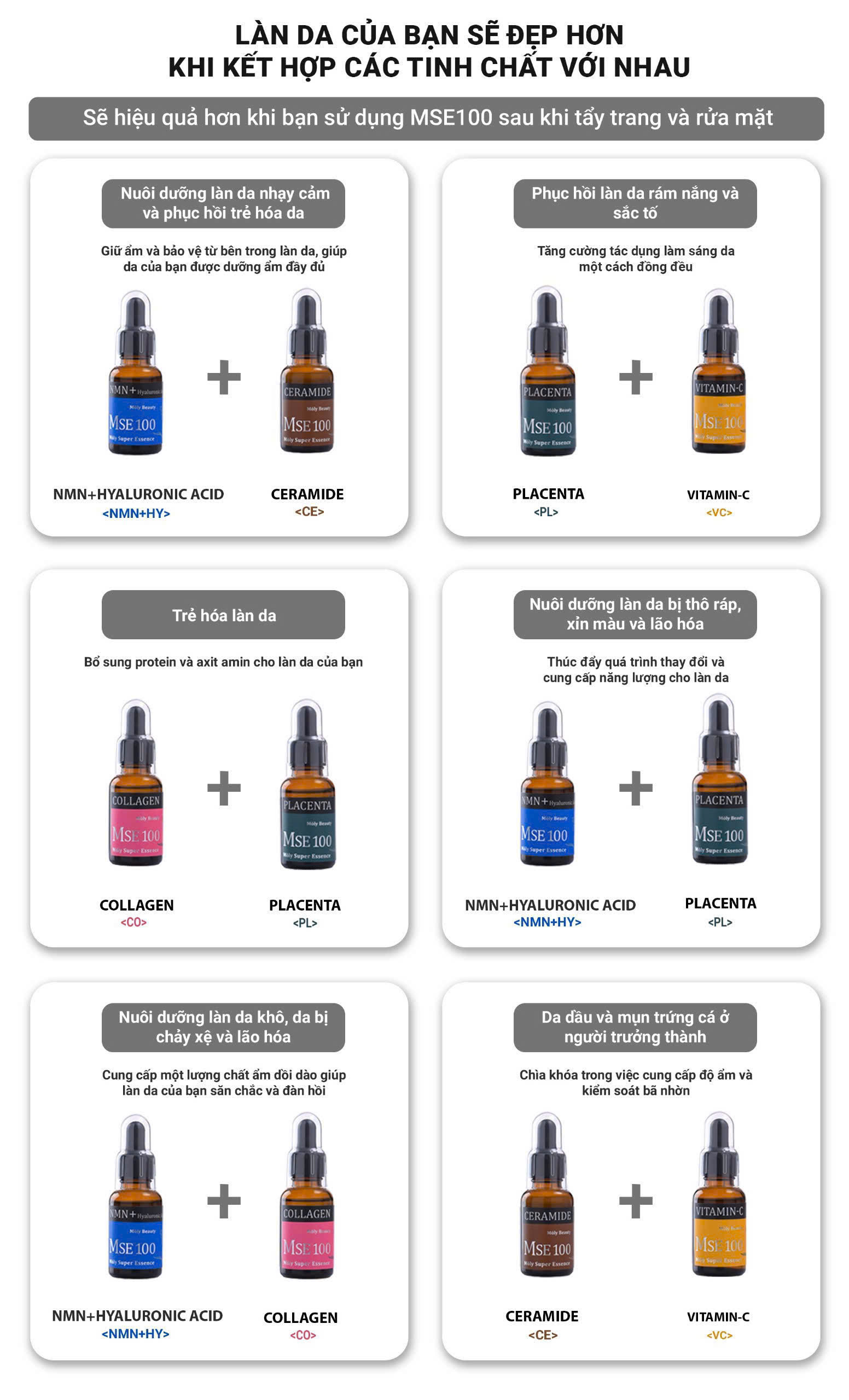 MÔ TẢ: Bộ quà tặng MSE100 tinh chất phục hồi trẻ hóa da NMN+HY 30ml + MSE100 tinh chất nhau thai tái sinh Placenta 30ml - Mōly Beauty Thương hiệu: Mōly Beauty Quy cách: 30ml