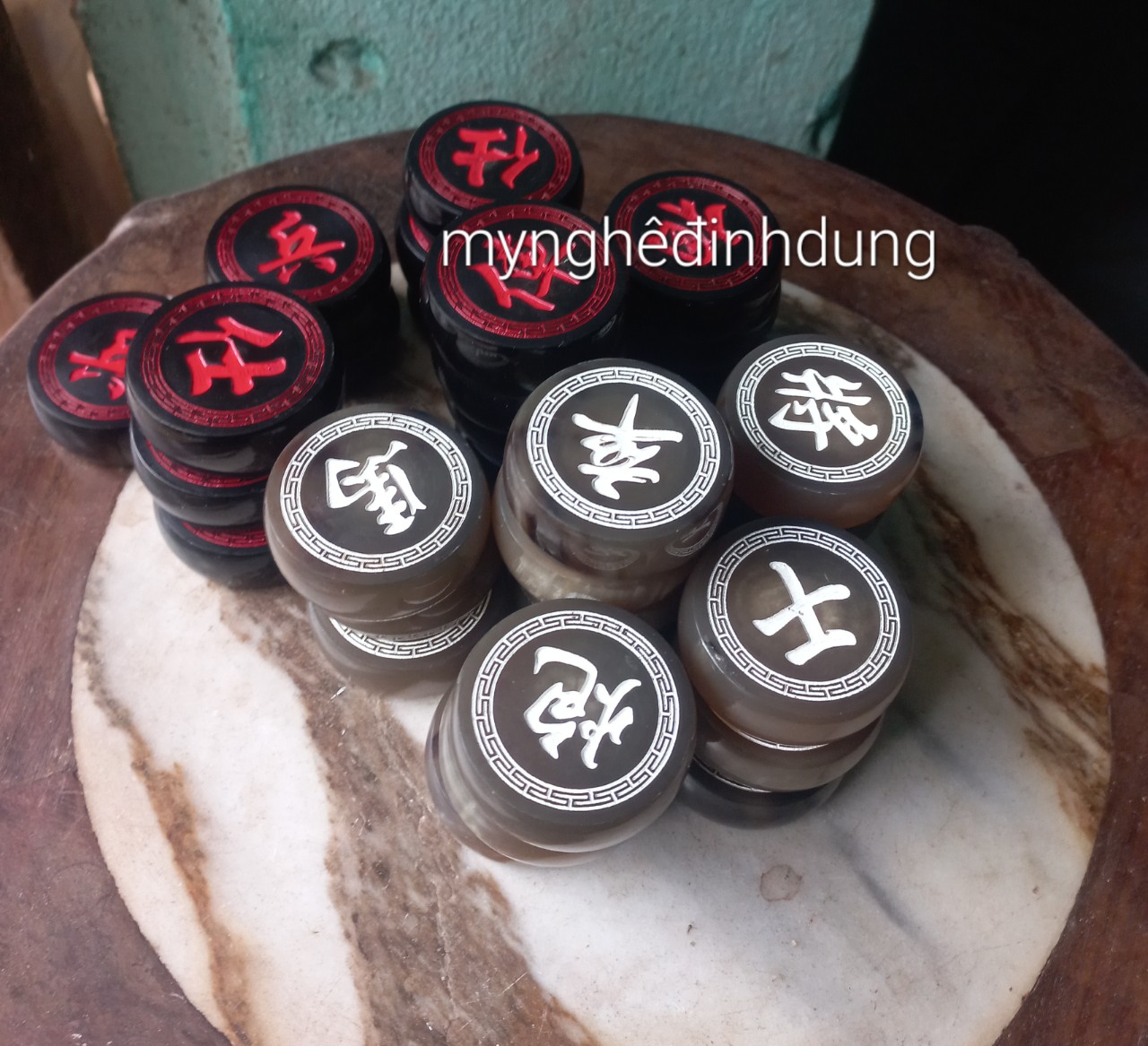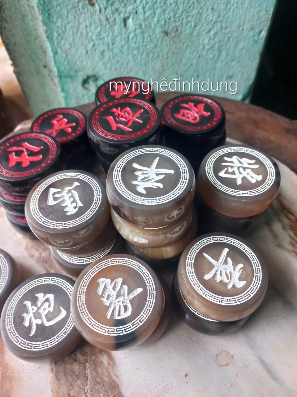 _ Bộ quân cờ sừng được làm bằng chất liệu sừng trắng ,sừng đen tự tự nhiên 100% _ Kt mặt tròn 4.0×1.2cm _ kt mặt tròn 4.3×1.2cm Và có nhiều kích thước khác ,khách