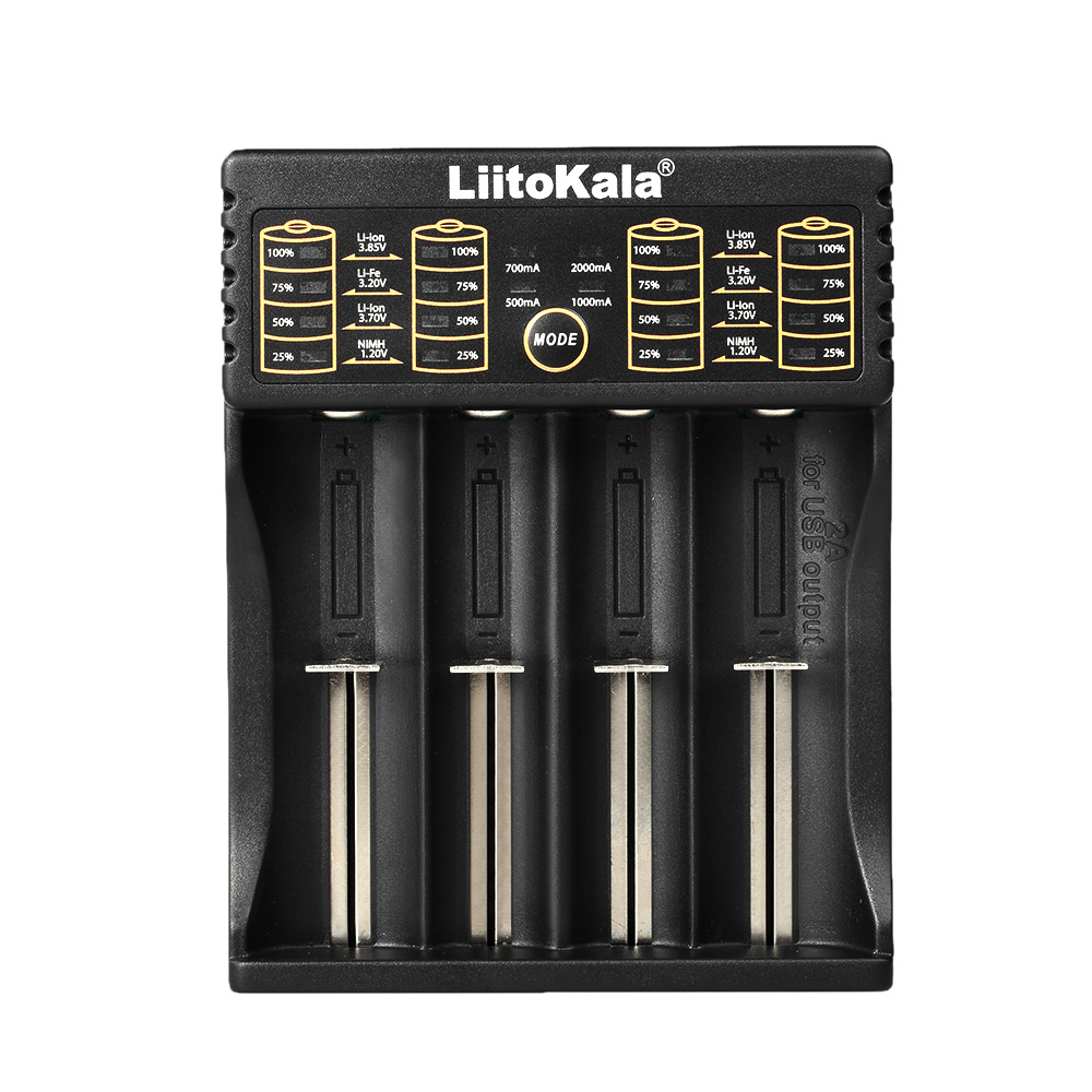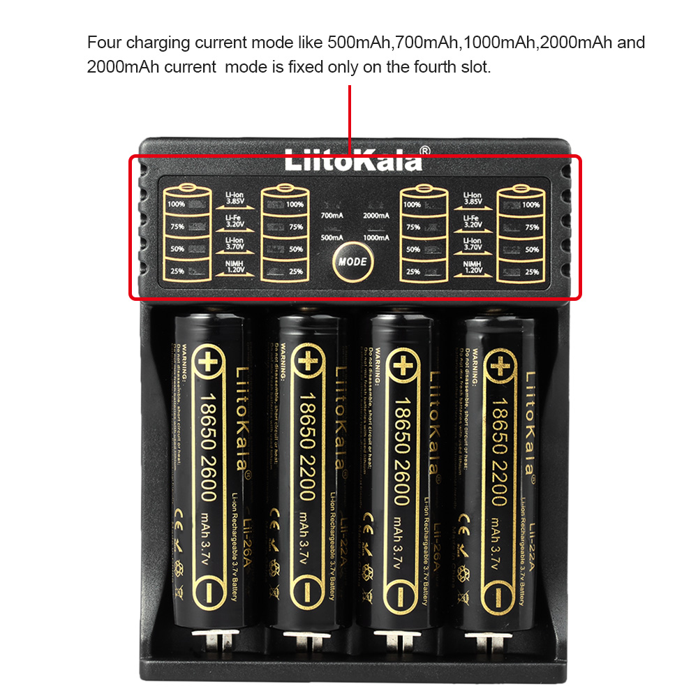 Features: 4-slots independent charging and independent management system, Micro USB DC 5V/2A input. With battery polarity auto-detection function(any polarity). Selective 0.5A/1A/2A charging currents for Lithium batteries by long press the current button. The defaulted current