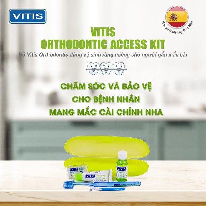 - Bộ kit Vitis Orthodontic với các thành phần hoạt tính và dụng cụ cần thiết hàng ngày giúp duy trì sức khỏe răng miệng lành mạnh, không mảng bám, nướu khỏe mạnh, hơi thở thơm mát, và ngăn ngừa sâu răng, giúp người đeo khí cụ chỉnh nha duy trì vệ sinh răng miệng hàng ngày.