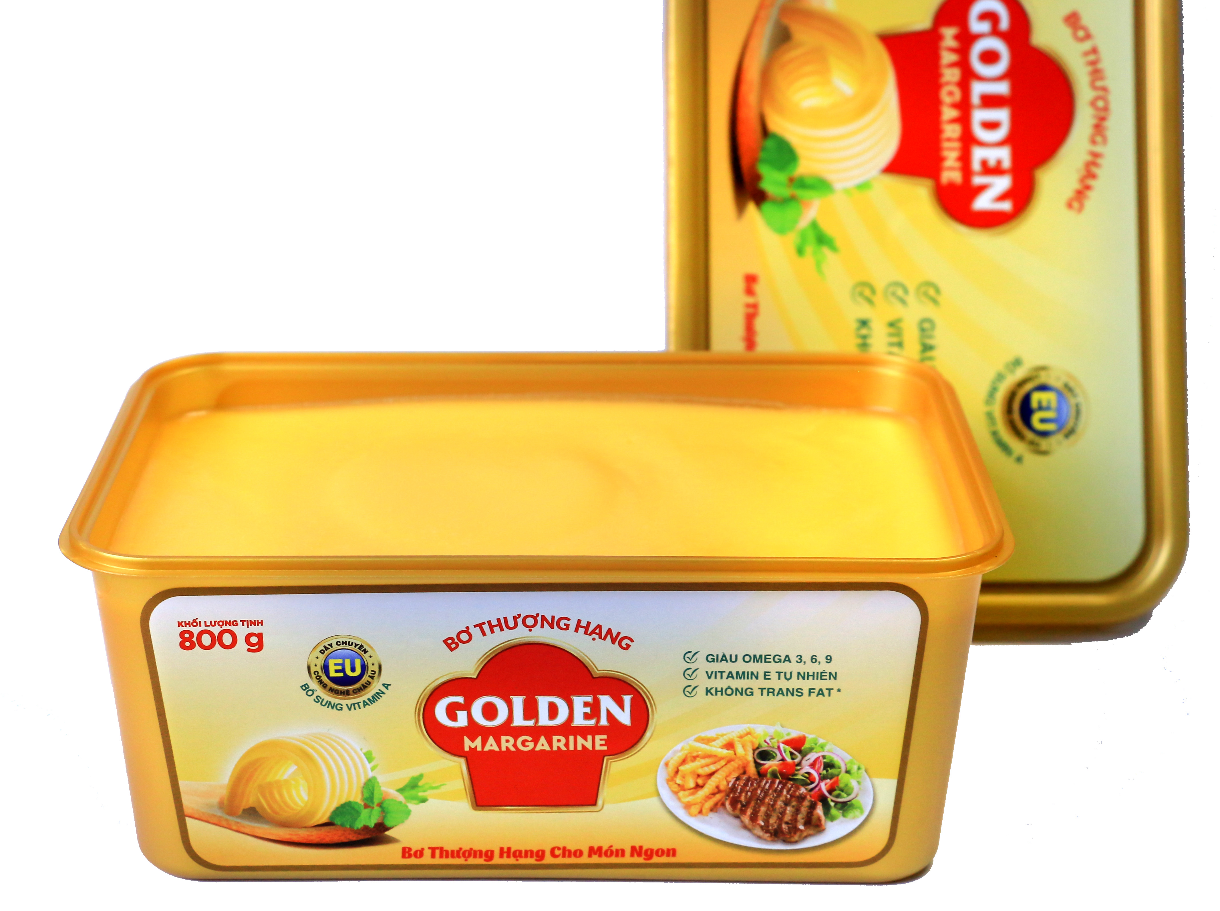 BƠ THƯỢNG HẠNG GOLDEN MARGARINE - BƠ THƯỢNG HẠNG CHO MÓN NGON Bơ thượng hạng Golden Magarine là một thực phẩm thơm ngon giúp tăng hương vị của món ăn và là một sản phẩm vô cùng quen thuộc với nhà nội trợ Việt. Bơ thượng hạng Golden Margarine được sản xuất tại Việt Nam theo dây chuyền công nghệ hiện đại từ Châu Âu, với thành phần được lựa chọn kỹ. Bơ thượng hạng Golden Margarine là bơ thực vật giàu Omega 3, 6, 9; Vitamin E tự nhiên; bổ sung Vitamin A; không chứa Transfat. Với hương bị thơm ngon đặc trưng, bơ thượng hạng Golden Margarine thường được sử dụng trong các công thức làm bánh ngọt, bánh mì, bánh quy, làm các món nướng, chiên xào, bắp rang bơ... hoặc dùng ăn trực tiếp với bánh mì.