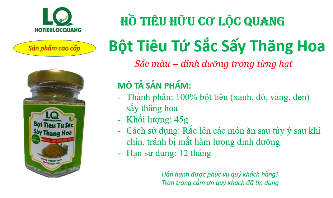 Hợp tác xã Hồ tiêu Lộc Quang xin kính chào Quý khách, cảm ơn Quý khách đã tin dùng sản phẩm của chúng tôi!