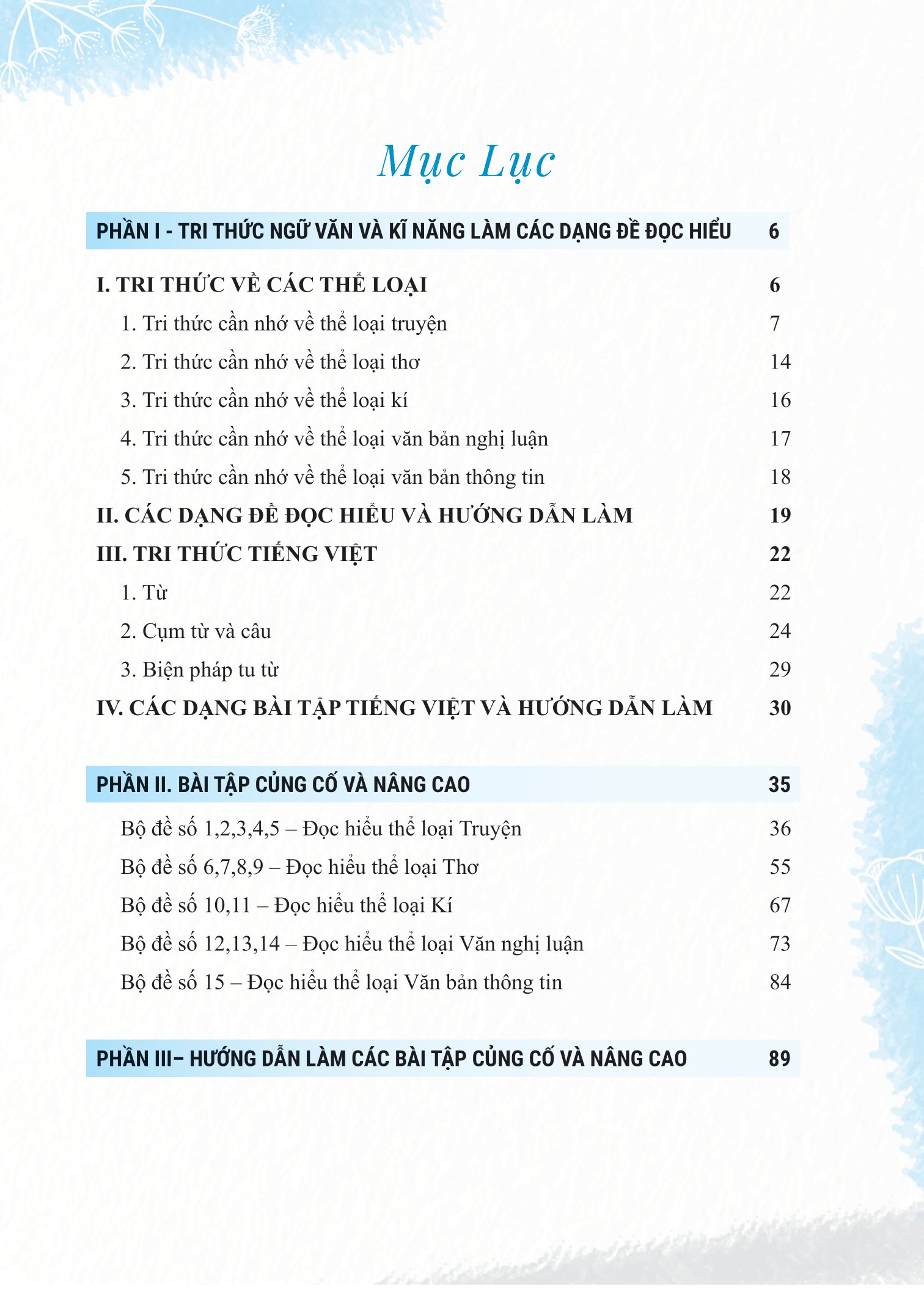 - Tổng quan cuốn sách được chia làm 2 phần chính - Tri thức Ngữ văn và kĩ năng làm các dạng đề đọc hiểu: Cung cấp hệ thống kiến thức đầy đủ, chi tiết và khoa học về các thể loại và các kiến thức tiếng Việt. Ngoài ra, những hướng dẫn cụ thể về các kiểu bài, những lưu ý và cách làm giúp các em hình thành kĩ năng xác định yêu cầu của đề, kĩ năng làm bài. - Các bài tập củng cố và nâng cao: 15 đề luyện tiêu biểu cho các thể loại kèm những hướng dẫn, đáp án chi tiết, giúp các em luyện tập để nâng cao năng lực đọc hiểu của mình.