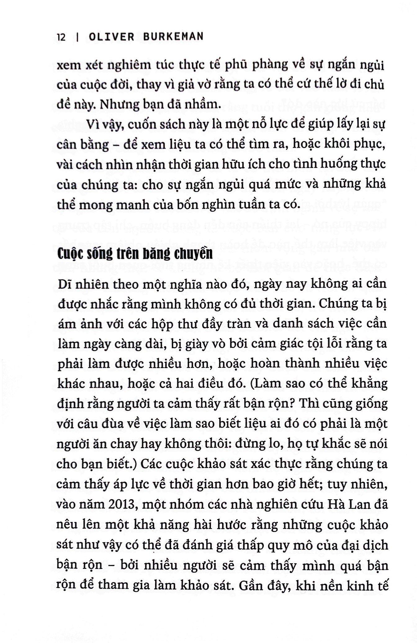 Không giống với những cuốn sách lời khuyên về năng suất và quản lý thời gian khác, với Bốn nghìn tuần, bằng cách tiếp cận thẳng thắn, chân thành, tác giả Oliver Burkeman đi vào phân tích và khám phá nỗi sợ hãi cố hữu về sự ngắn ngủi của kiếp người, đồng thời chỉ ra rằng chỉ bằng cách chấp nhận và đối mặt với những giới hạn của m.ình, chúng ta mới có thể thật sự sống một cuộc đời trọn vẹn.