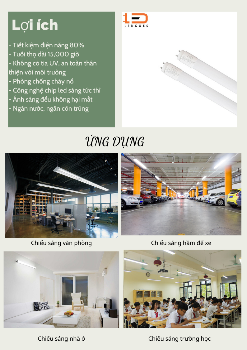 THÔNG TIN SẢN PHẨM Tiết kiệm đến 65 % điện năng Tiết kiệm 65% điện năng thay thế bộ đèn huỳnh quang T8 1.2m 36Wx2Giúp giảm chi phí hóa đơn tiền điện. Tuổi thọ cao Tuổi thọ cao 25000 giờ,độ tin cậy cao,không hạn chế số lần bật tắtCao gấp 2-2.5 lần so với đèn huỳnh quang T8 Dải điện áp hoạt động rộng,tương thích điện từ trường EMC/EMI Đèn LED códải điện áp rộng (150-250V) ánh sáng vàcông suất không thay đổi khi điện áp lưới thay đổi.Tương thích điện từ trường không gây ra hiện tượng nhiễu cho sản phẩm điện tử và không bị ảnh hưởng nhiễu của các thiết bị điện tử khác Hệ số trả màu (CRI >= 80) Hệ số trả màu cao (CRI >= 80),ánh sáng trung thực tự nhiên.Tăng khả năng nhận diện màu sắc của vật được chiếu sáng.Đáp ứng tiêu chuẩn chiếu sáng Việt Nam TCVN 7114:2008 Đáp ứng Tiêu chuẩn Việt Nam (TCVN),Quốc tế (IEC) TCVN 7722-1:2009/ IEC 60598-1:2008:về đèn điện Thân thiện môi trường Không chứa hóa chất độc hại,không phát ra tia tử ngoại,an toàn cho người sử dụng Ứng dụng
