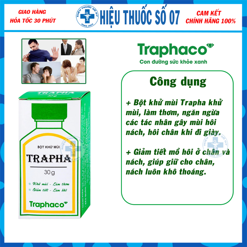Bột khử mùi hôi nách, hôi chân, hôi giày, Trapha hỗ trợ khử mùi, sát trùng, làm thơm, giảm tiết, làm khô hộp 30g Thành phần bột khử mùi Trapha Kali nhôm sulfat khan ... 28 g Kẽm oxyd ... 1 g Đồng sulfat … 1 g Chất thơm ... vừa đủ Tác dụng bột khử mùi Trapha Bột khử mùi Trapha khử mùi, làm thơm, ngăn ngừa các tác nhân gây mùi hôi nách, hôi chân khi đi giày. Giảm tiết mồ hôi ở chân và nách, giúp giữ cho chân, nách luôn khô thoáng.. Giảm thiểu tác nhân nên không gây vàng ố quần áo khi sử dụng. Cách dùng bột khử mùi Trapha