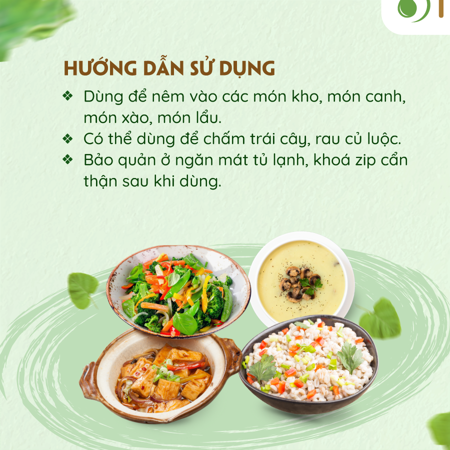 Hướng dẫn sử dụng: Dùng để nêm vào các món kho, món canh, món xào, món lẩu.