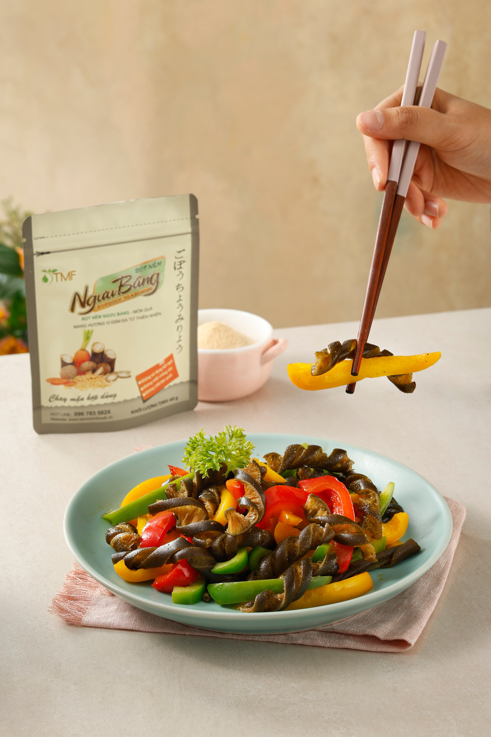 Bột nêm Ngưu Báng – Món quà mang hương vị đậm đà từ thiên nhiên. Thành phần: muối, ngưu báng, nấm đông cô, cà rốt, protein đậu nành, chiết xuất lúa mạch, đường vàng. Bột