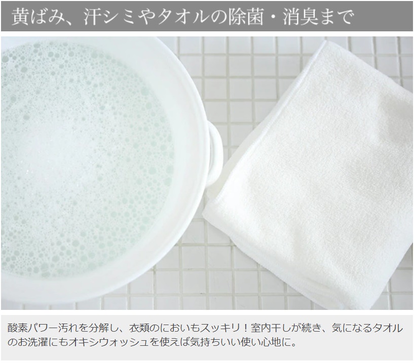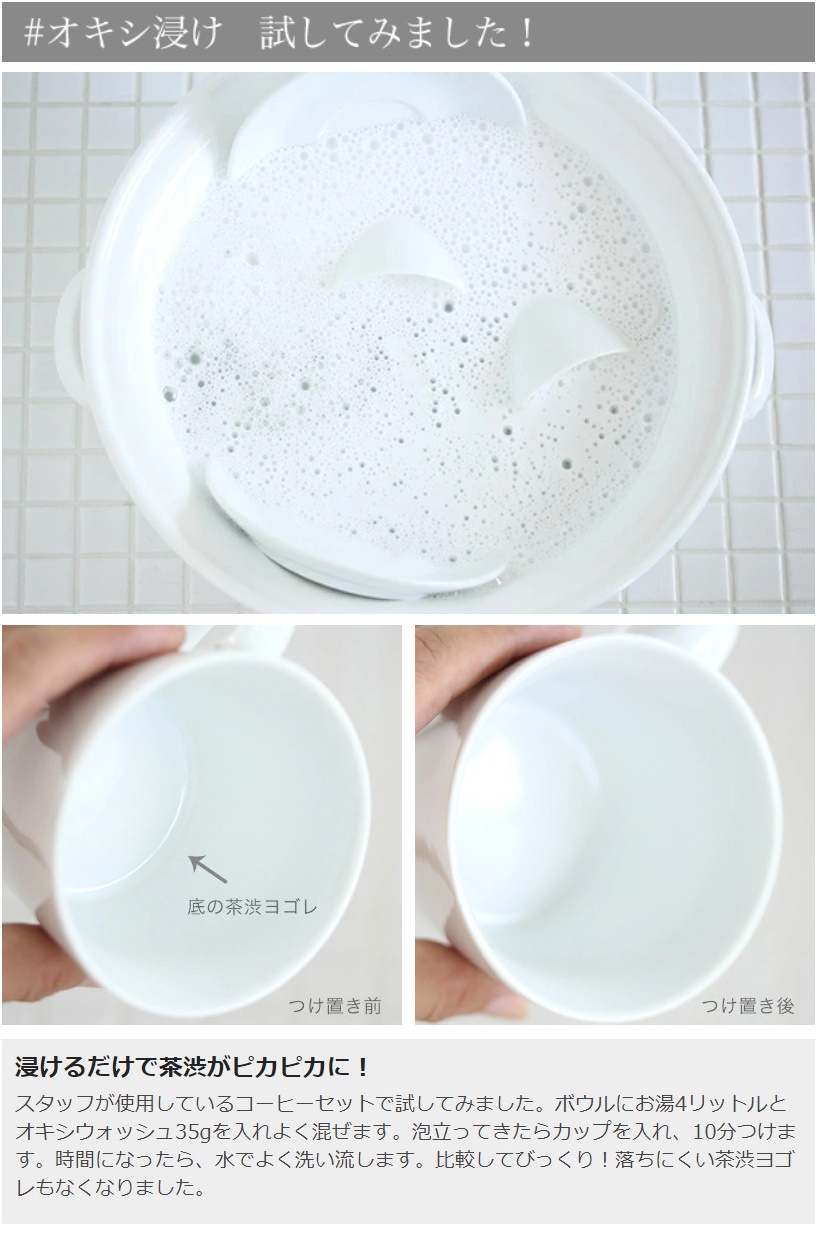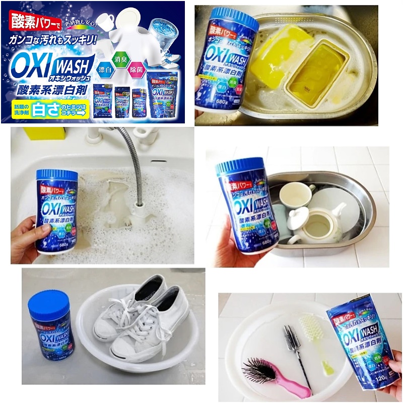 - Công dụng: OXI WASH sử dụng tẩy các vật dụng như cặn bình trà, vết cáu bẩn ở bát/ chén/ đĩa/ thìa/ muôi & những vết bẩn lưu bám trên giầy, tất, quần áo, rèm, bồn tắm, vết bám bẩn trên tường, sàn nhà, cửa, lồng máy giặt, bếp gas, bếp từ lò vi sóng... v.v