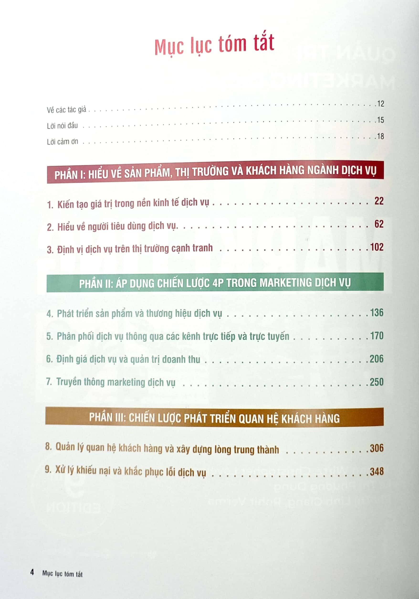 Tóm lại, bộ sách này đặt các vấn đề về marketing trong bối cảnh chung khái quát dưới góc nhìn quản trị. Bộ sách cung cấp là một “hộp công cụ” được thiết kế và biên soạn tỉ mỉ dành cho các nhà quản trị ngành dịch vụ. Người đọc sẽ tìm hiểu cách sử dụng các khái niệm, lý thuyết và mô hình một cách tốt nhất để phân tích và giải quyết những thách thức đa dạng mà các nhà quản trị kinh doanh dịch vụ đang phải đối mặt.