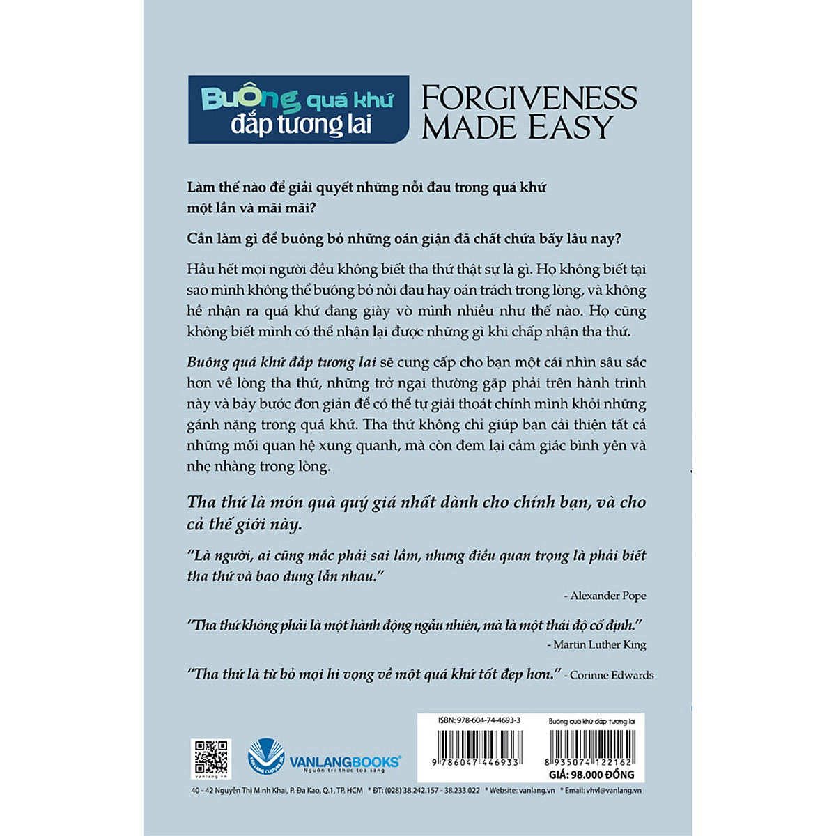 Buông quá khứ đắp tương lai sẽ cung cấp cho bạn một cái nhìn sâu sắc hơn về lòng tha thứ, những trở ngại thường gặp phải trên hành trình này và bảy bước đơn giản để có thể tự giải thoát chính mình khỏi những gánh nặng trong quá khứ. Tha thứ không chỉ giúp bạn cải thiện tất cả những mối quan hệ xung quanh, mà còn đem lại cảm giác bình yên và nhẹ nhàng trong lòng.