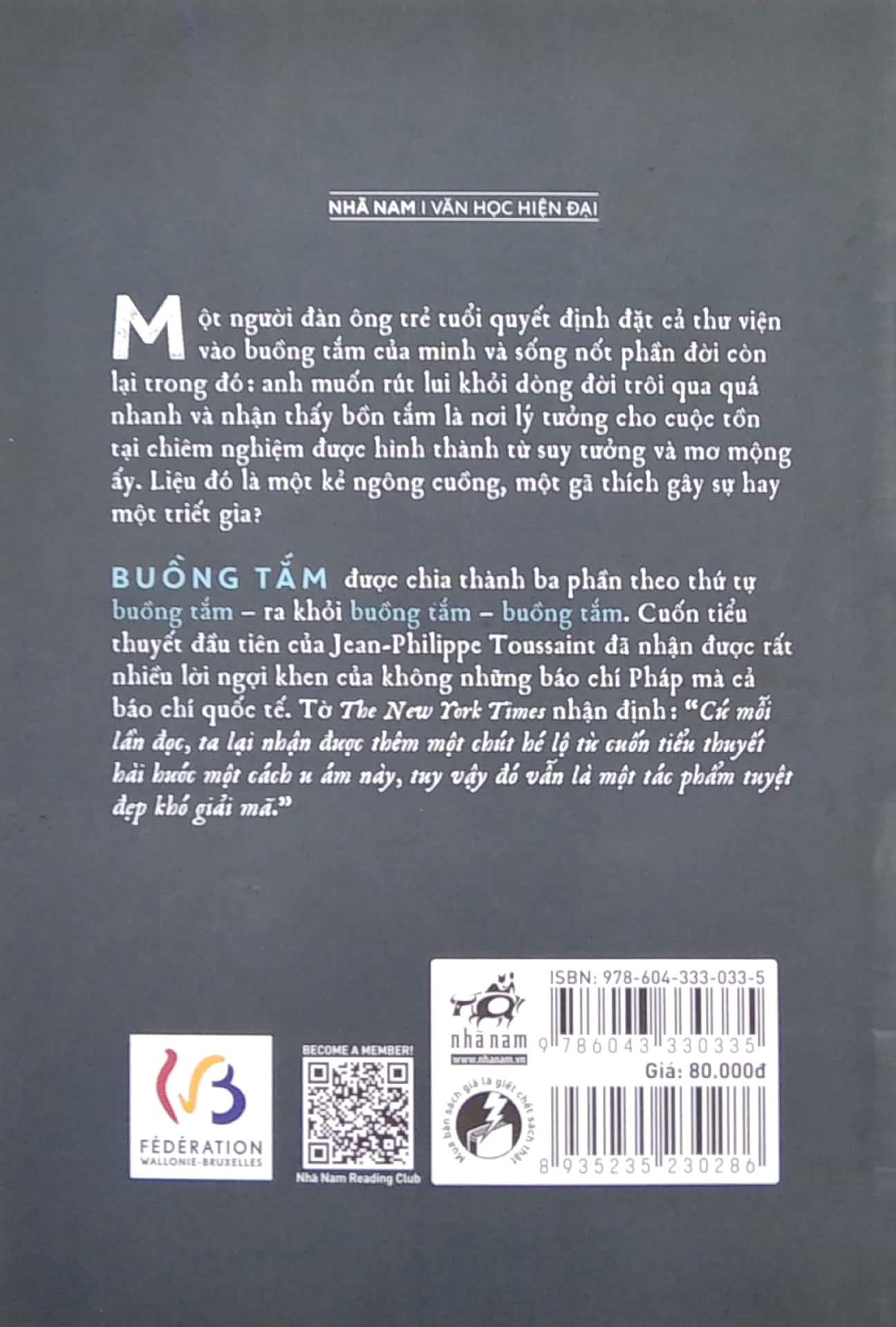 Buồng tắm được chia thành ba phần theo thứ tự buồng tắm – ra khỏi buồng tắm – buồng tắm. Cuốn tiểu thuyết đầu tiên của Jean-Philippe Toussaint đã nhận được rất nhiều lời ngợi khen của không những báo chí Pháp mà cả báo chí quốc tế. Tờ The New York Times nhận định: “Cứ mỗi lần đọc, ta lại nhận được thêm một chút hé lộ từ cuốn tiểu thuyết hài hước một cách u ám này, tuy vậy đó vẫn là một tác phẩm tuyệt đẹp khó giải mã.”
