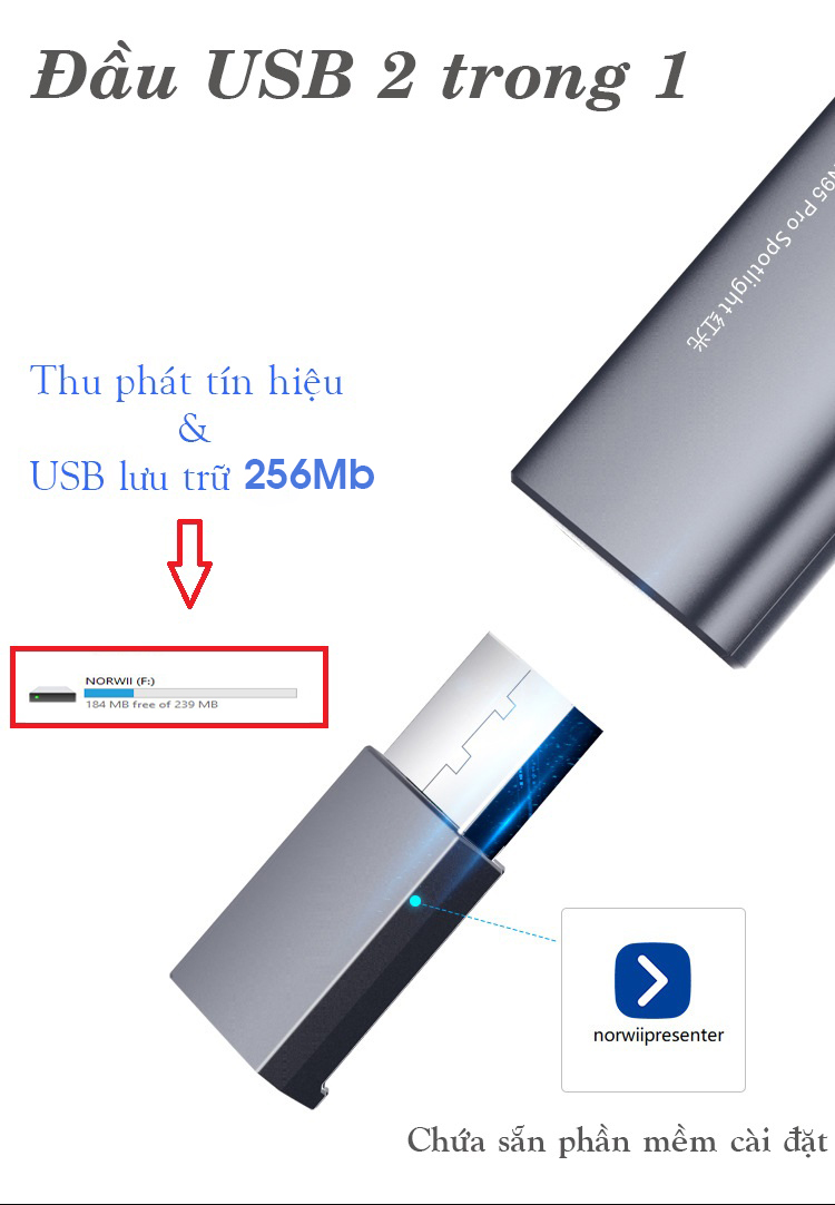 Bút trình chiếu NORWii N95 Pro Spotlight cao cấp 2in1Thông số kỹ thuật : Model : NORWii N95 Pro SPOTLIGHTKết nối : 2.4GHzĐầu USB 2in1 :thu phát Wireless 2.4Ghz và USB dung lượng lưu trữ 256MBBán kí...